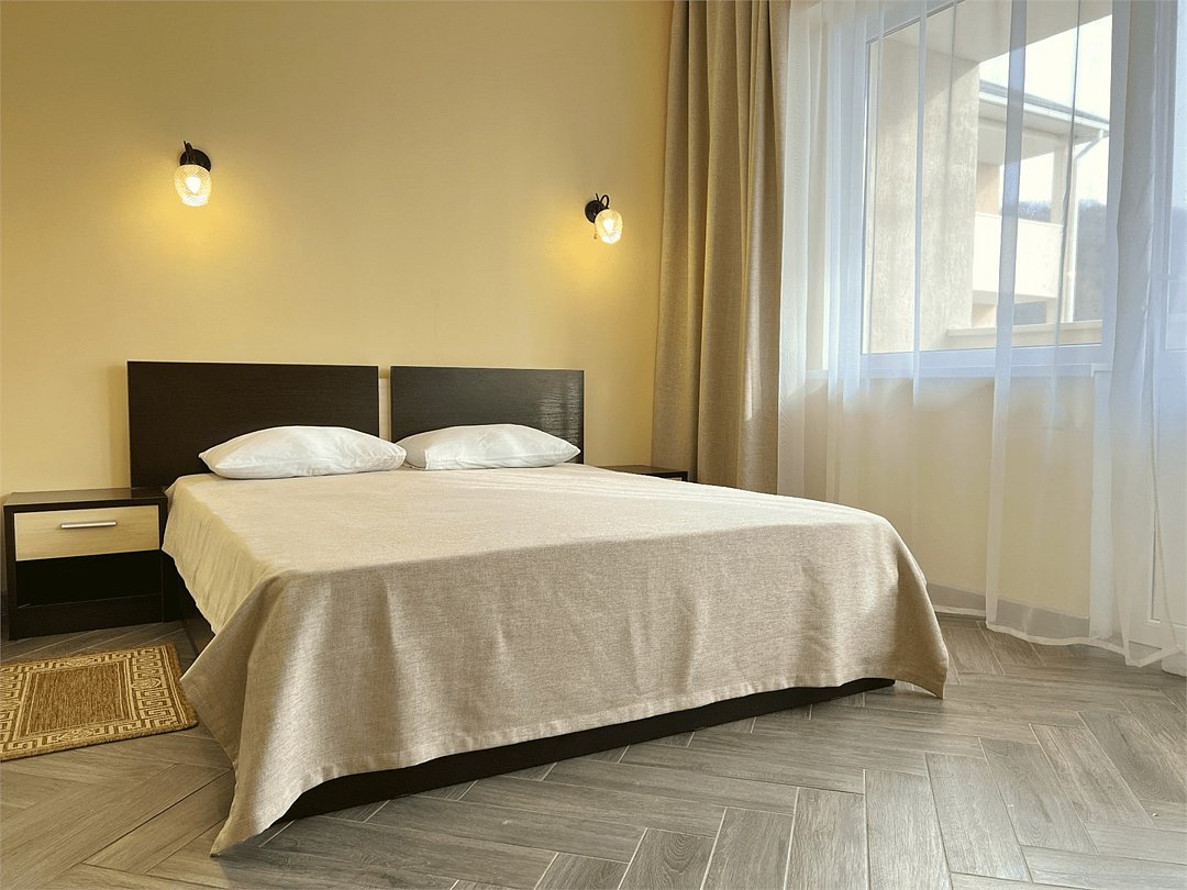 Номера категории "Комфорт" общая площадь 24 кв.м. В комплектацию номера входит две кровати (полуторки), две тумбочки, в каждой комнате имеется большой плательный шкаф, телевизор, кондиционер, обеденный стол для приятного ужина, чайник, холодильник, туалет, душевая кабина. В каждом номере есть балкон с прекрасным видом на море.Услуги и удобства