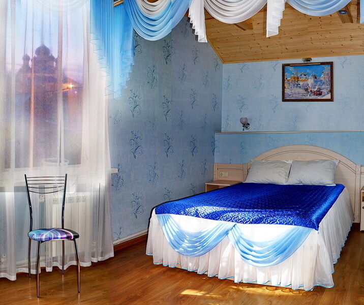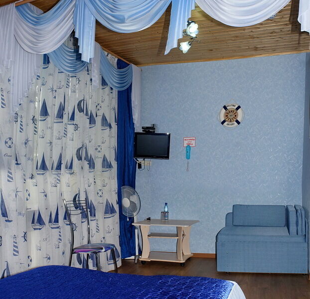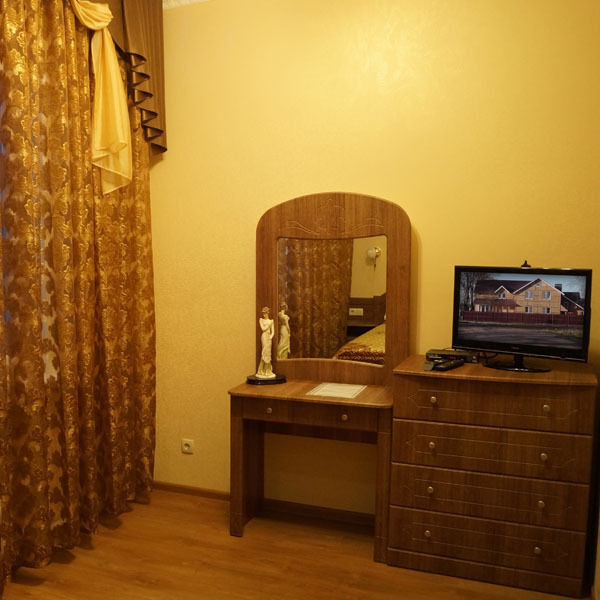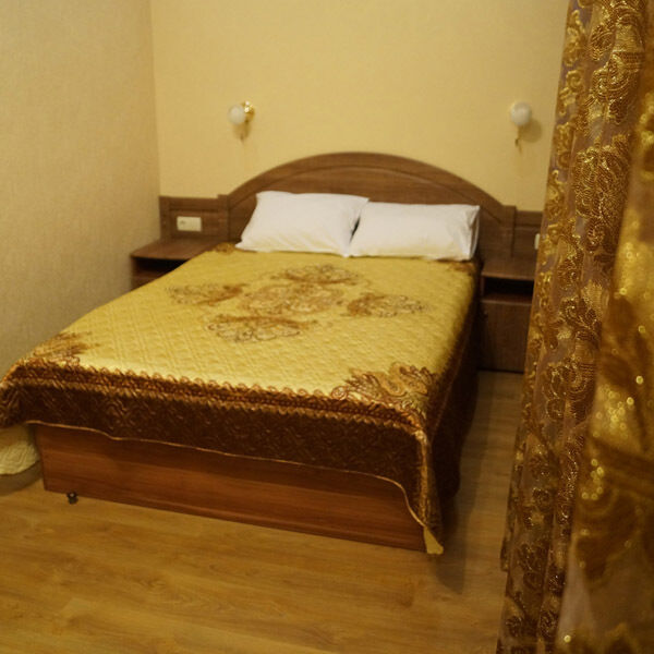В номере: двуспальная кровать, шкаф для одежды, журнальный столик, плазменный телевизор, холодильник.