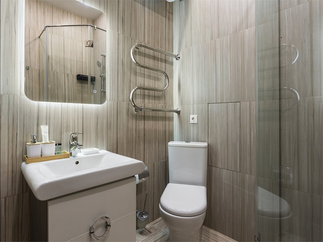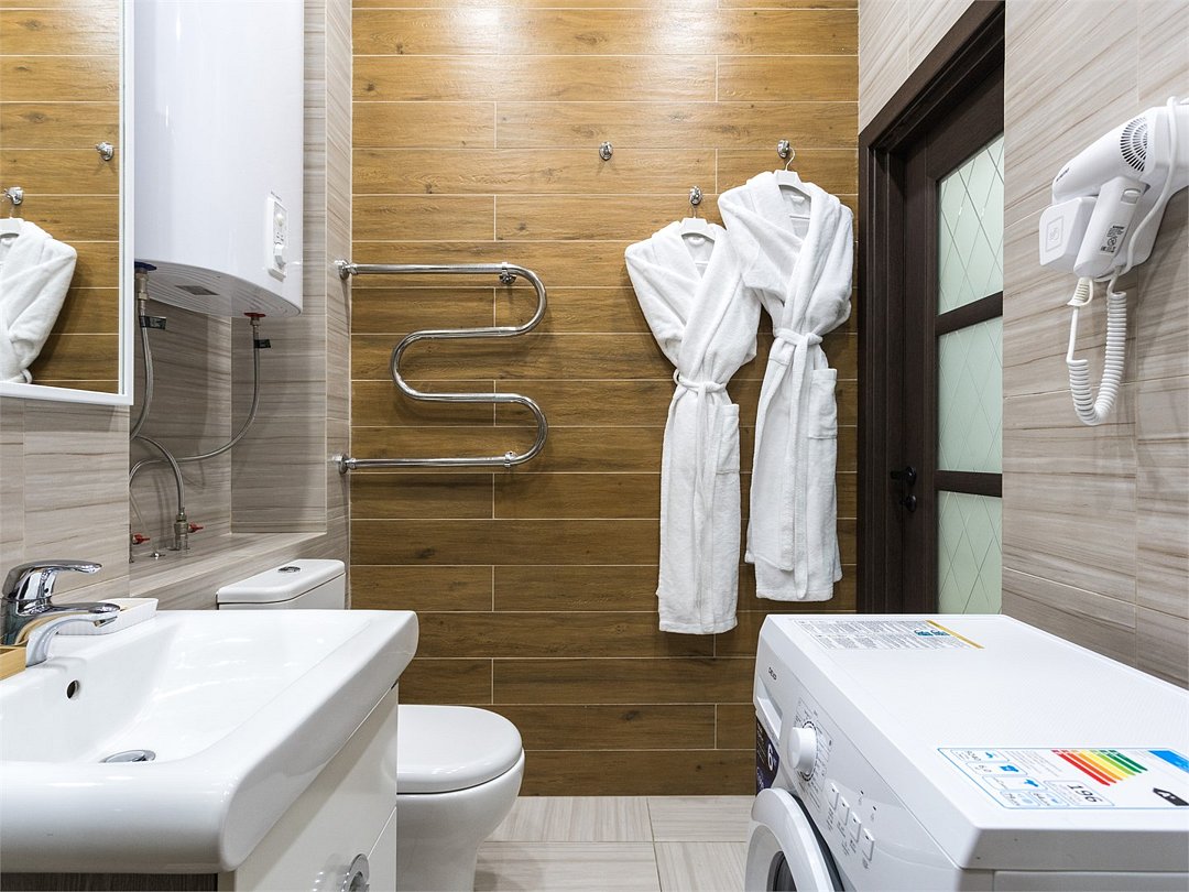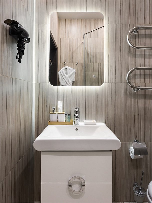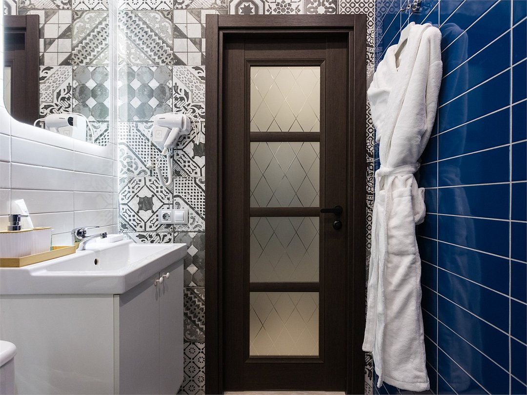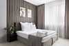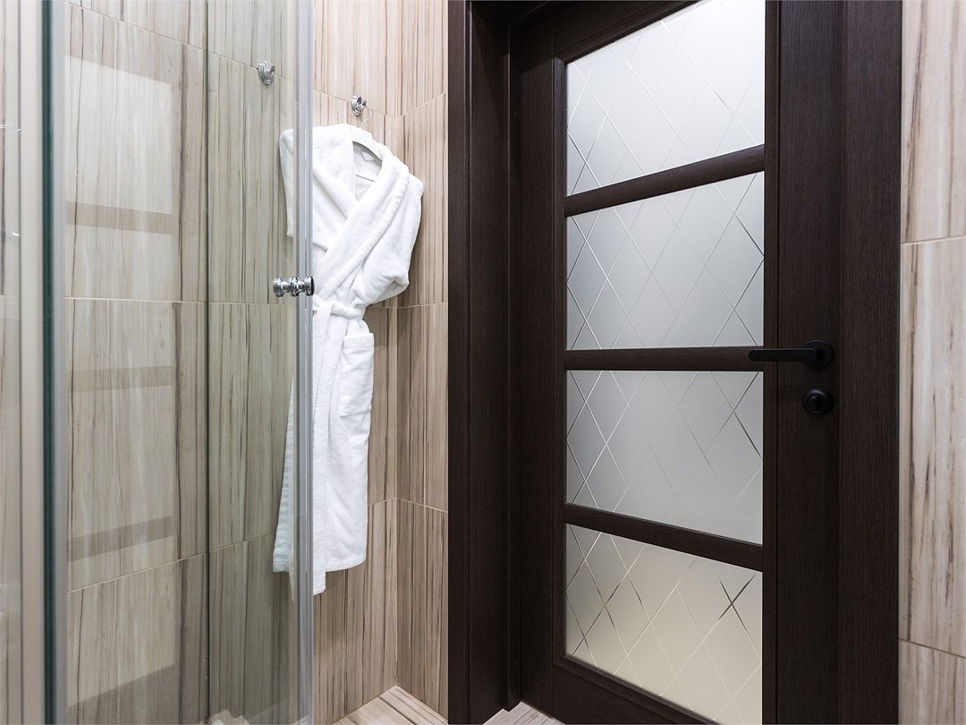 телевизор, Wi-Fi, IP-телефон, кондиционер, фен, ванная комната, душевая кабина, халаты, банные полотенца, тапочки, гигиенические средства, косметические средства, двуспальная кровать, гипоаллергенное белье, ортопедический матрас, шкаф для одежды, зеркало, мини-бар, обслуживание номеров, сейф, унитаз, раковина, косметическое зеркалоВ аппартаментах