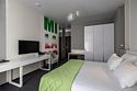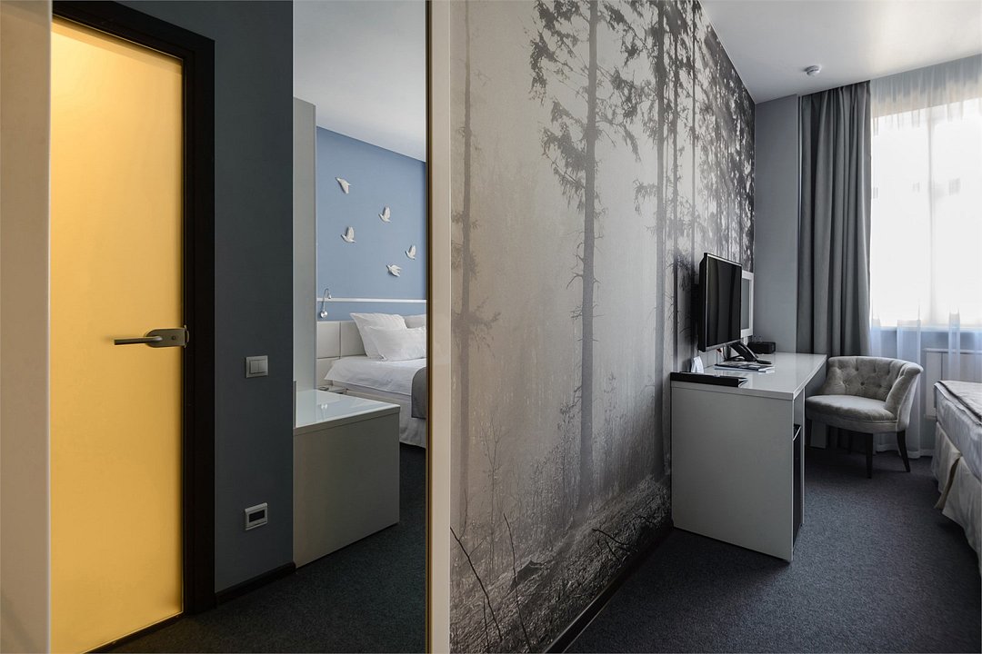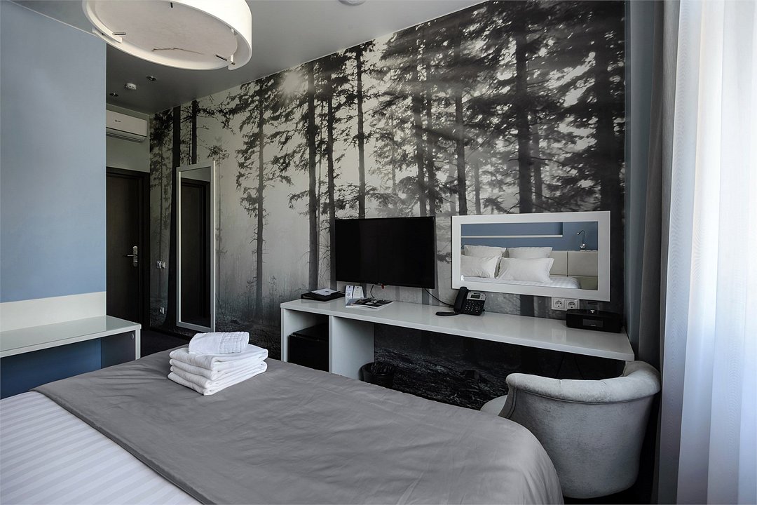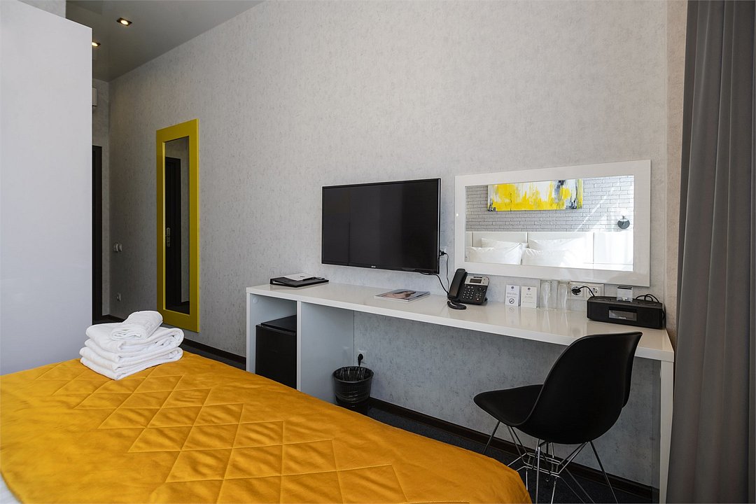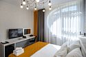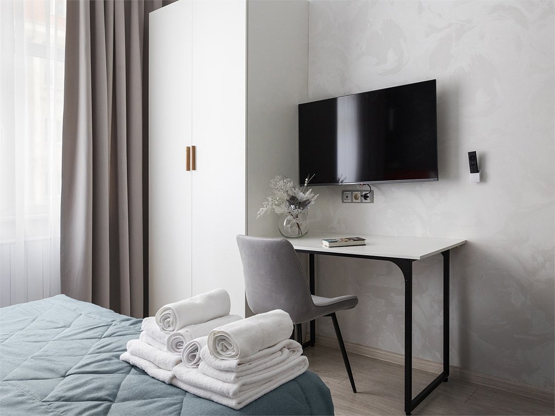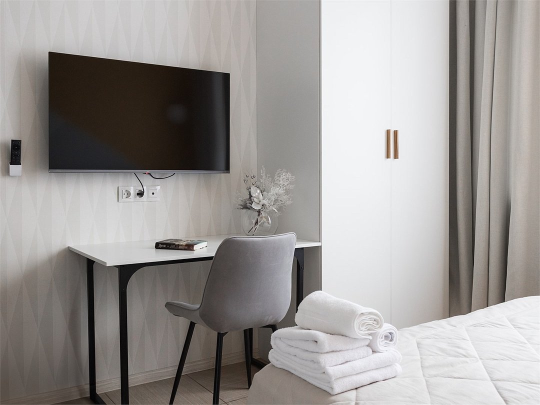 телевизор, Wi-Fi, IP-телефон, кондиционер, фен, ванная комната, душевая кабина, теплый пол, халаты, банные полотенца, тапочки, гигиенические средства, двуспальная кровать, гипоаллергенное белье, ортопедический матрас, шкаф для одежды, письменный стол, зеркало, мини-бар, обслуживание номеров, сейф, косметическое зеркалоВ аппартаментах