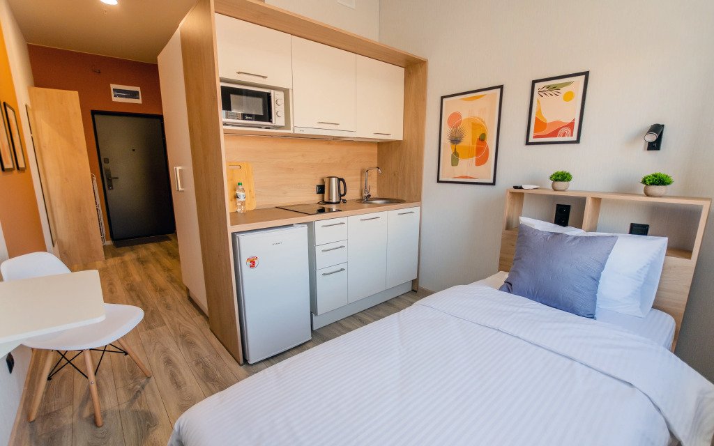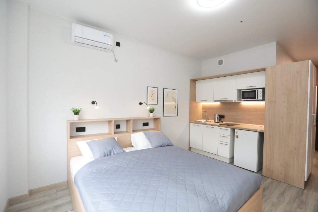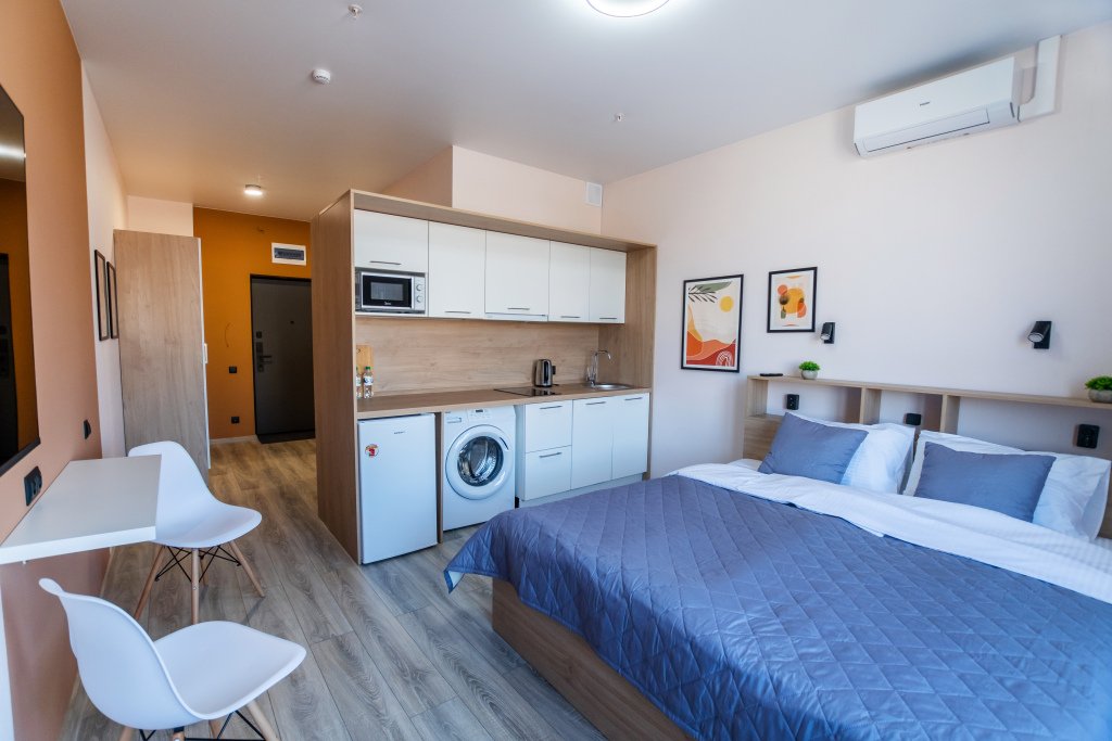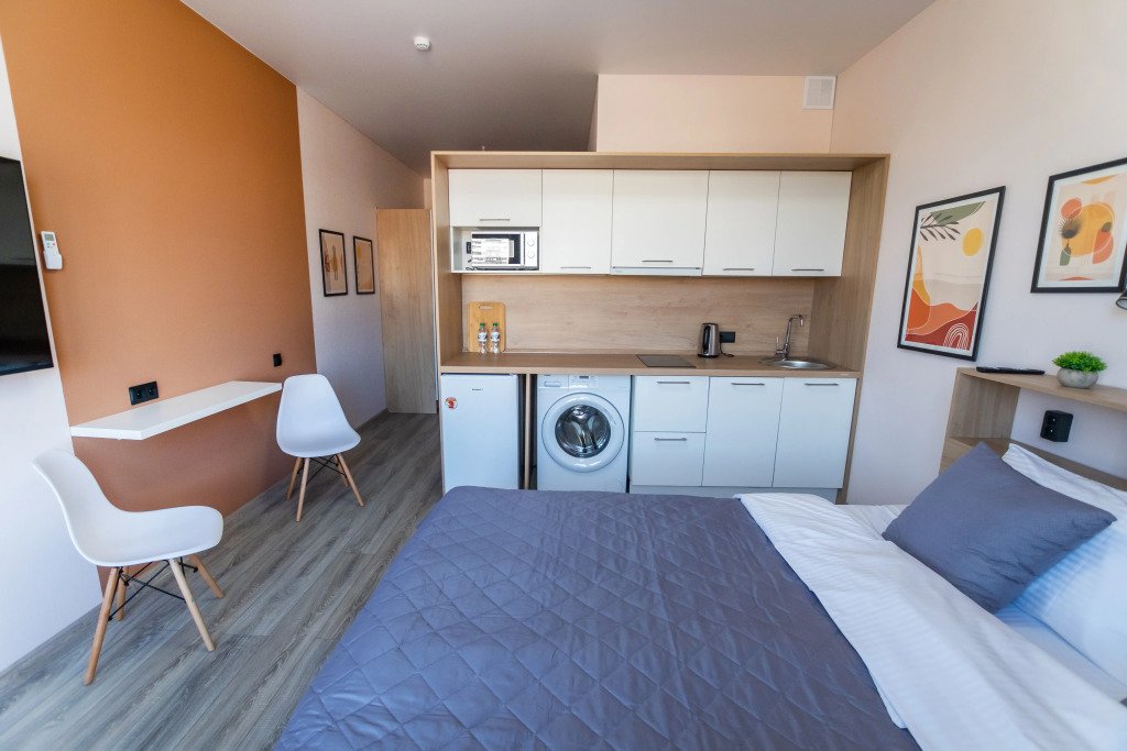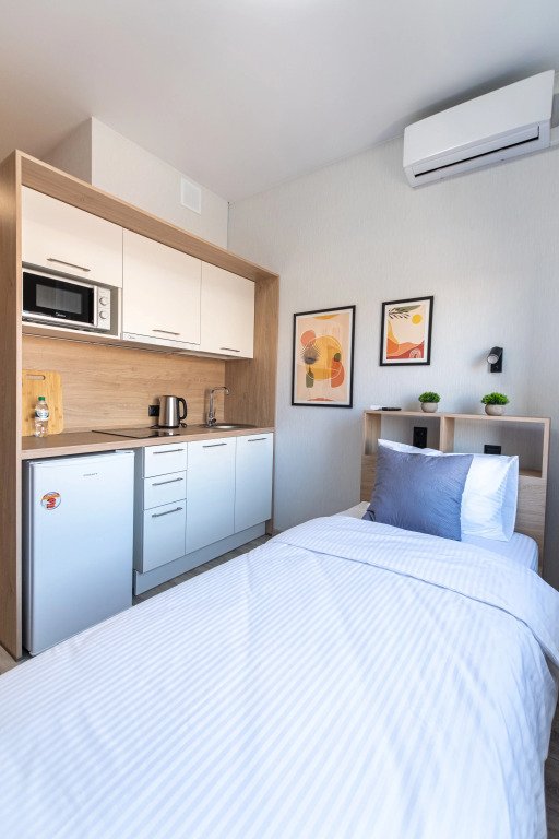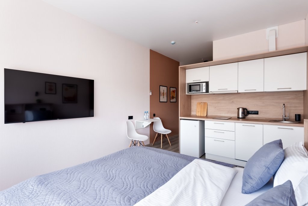 В комплексе апартаментов представлены номера повышенной комфортности: «Одноместный номер», Студия «Стандарт», Студия «Стандарт +». Во всех номерах есть полноценные кухонные зоны с наличием необходимой бытовой техники и приборов, спальные места, оборудованные ортопедическими матрасами с независимыми пружинными механизмами и высококачественным постельным бельём, полный набор бытовой техники и наборами для душа. Номера оборудованы системой звукоизоляции и светонепроницаемыми занавесками.