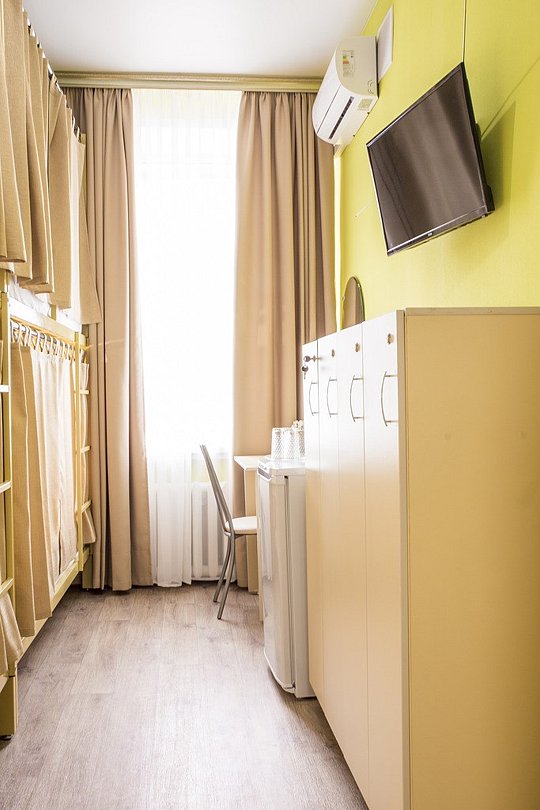 телевизор, Wi-Fi, холодильник, кондиционер, светильник, фен, система безопасности, плита для приготовления пищи, микроволновая печь, санузел, тапочки, гигиенические средства, косметические средства, гладильная доска, стулья, шкаф для одежды, вешалки, письменный стол, обеденный стол, зеркало, кухня, чайный набор, набор посуды, чайник, унитаз, питьевая вода, обеденная зона, двухъярусные кровати, отопление, душ, вид на город, раздельный санузел, высокие потолкиВ месте в номере