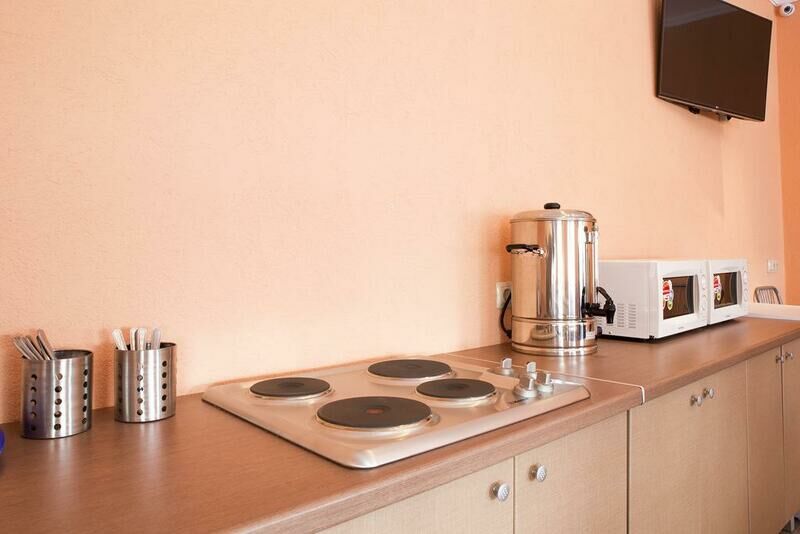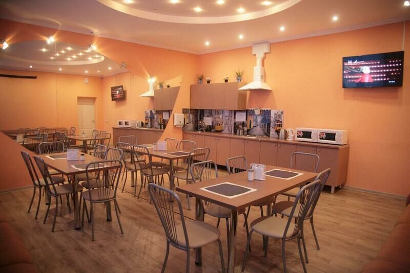В хостеле "Евразия" располагается уютная столовая, рассчитанная на 30 посадочных мест. Это место, где вы сможете не только приятно провести время за чашечкой