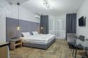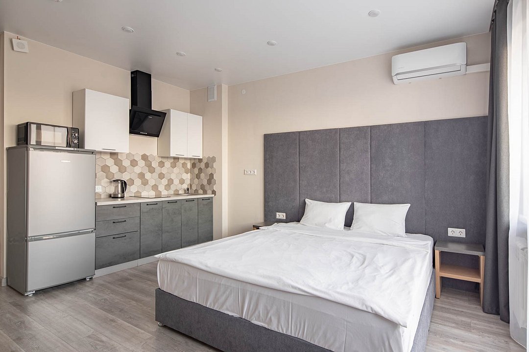 Номера категории “Апартамент” отличаются друг от друга, так как ремонт и оснащение не стандартизировано в данной категории номеров. На фото представлен один из номеров для общего представления. Номер вмещает до двух гостей, оборудован диваном или двуспальной кроватью (уточняйте у администратора), телевизором с ТВ-приставкой, кондиционером, набором постельного белья, а также стиральной машиной и гладильными принадлежностями. В ванной комнате имеются средства личной гигиены, ванна или душевая кабина, туалет, фен и полотенца, а также бойлер для нагрева воды в период отсутствия горячей воды. Для самостоятельного приготовления еды и напитков предусмотрена собственная кухня, где установлены электрический чайник и микроволновая печь, плита и холодильник, обеденный стол со стульями и кухонными приборами.Услуги и удобства