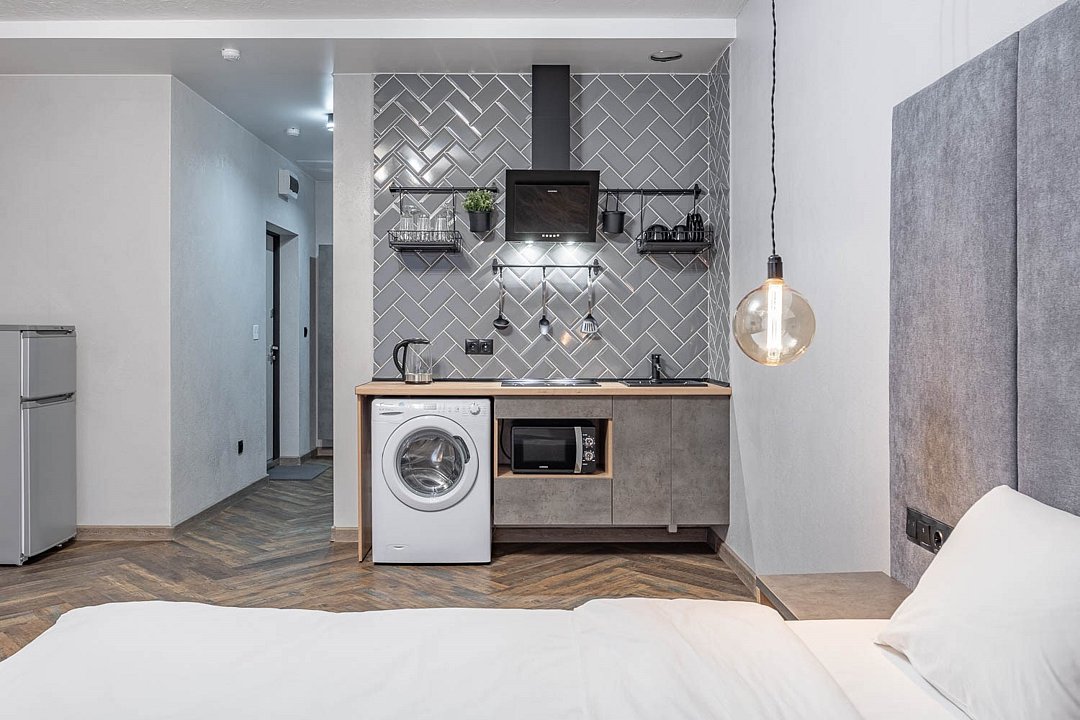 Номер вмещает до двух гостей, оборудован диваном, телевизором с ТВ-приставкой, кондиционером, набором постельного белья и полотенец. В вашем распоряжении стиральная и сушильная машины и гладильные принадлежности. В ванной комнате имеются средства личной гигиены, душевая кабина, туалет, фен, а также бойлер для нагрева воды в период отсутствия горячей воды. Для самостоятельного приготовления еды и напитков предусмотрена кухонная зона, где установлены электрический чайник, микроволновая печь, плита и холодильник.Услуги и удобства