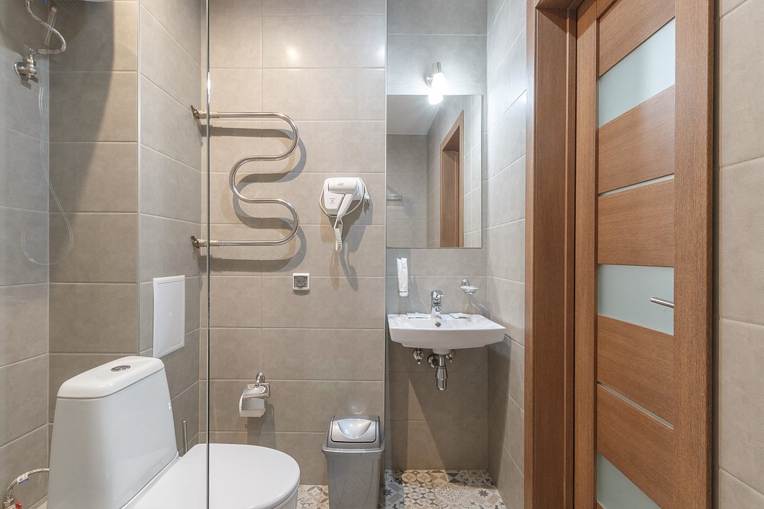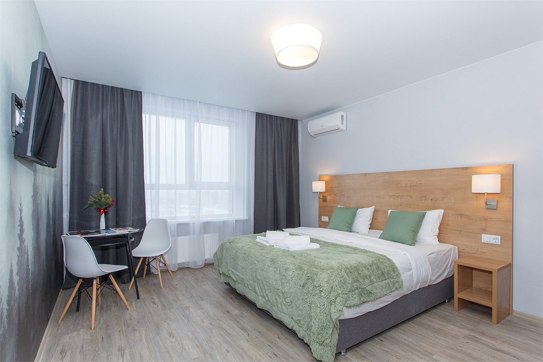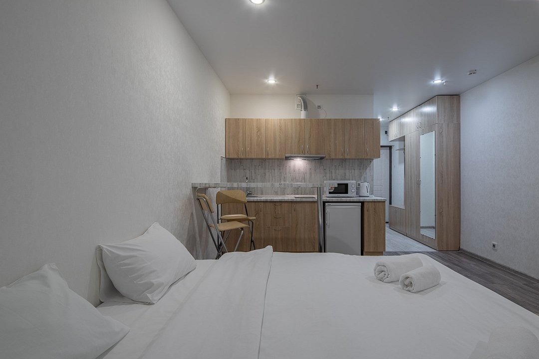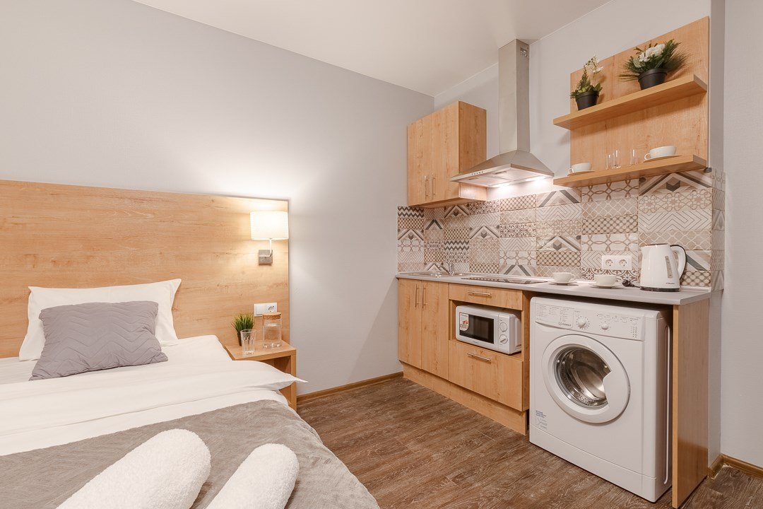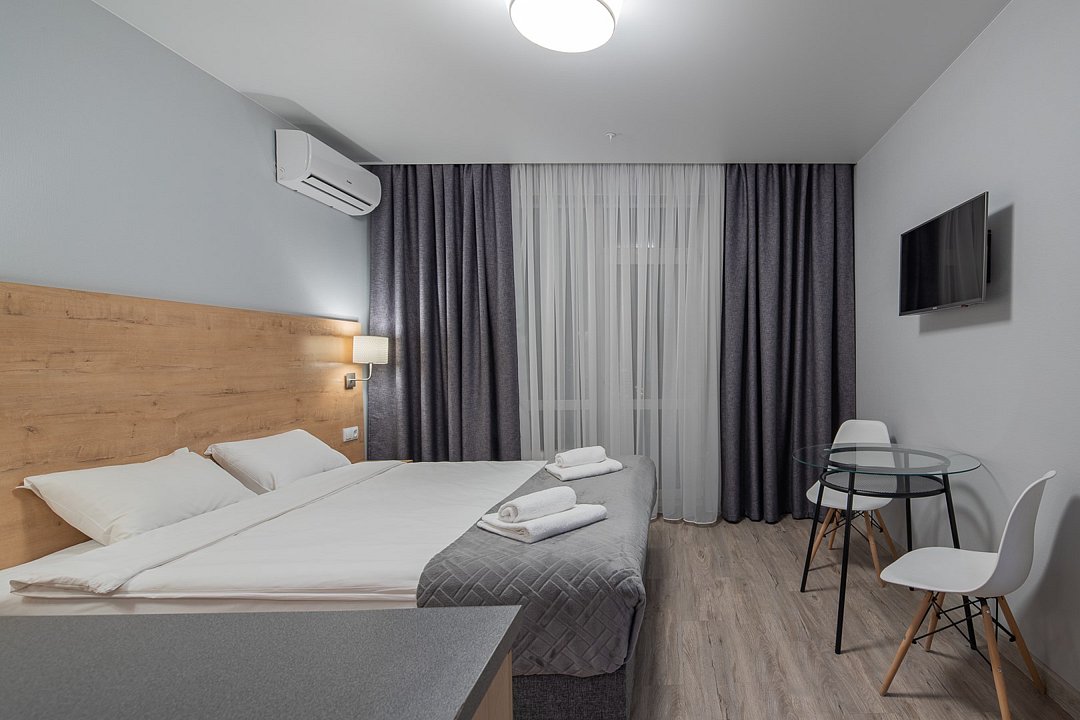 Wi-Fi, интернет, холодильник, кондиционер, светильник, фен, плита для приготовления пищи, микроволновая печь, утюг, ванная комната, душевая кабина, санузел, водонагреватель, гигиенические средства, косметические средства, двуспальная кровать, гладильная доска, тумбы, стулья, шкаф для одежды, вешалки, обеденный стол, зеркало, кухня, чайный набор, набор посуды, стиральная машина, чайник, унитаз, раковина, отопление, душ, вид на город, кухонная посуда, стаканы, кухонная утварь, столовые приборы, туалетные средства, туалет, цифровое тв, телевизор с плоским экраном, usb порт, морозильная камера, уборка номера, набор для приготовления чая и кофе, вешалки-плечикиВ номере