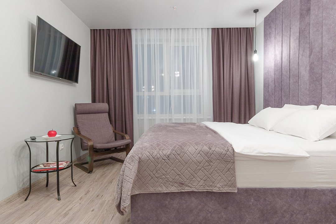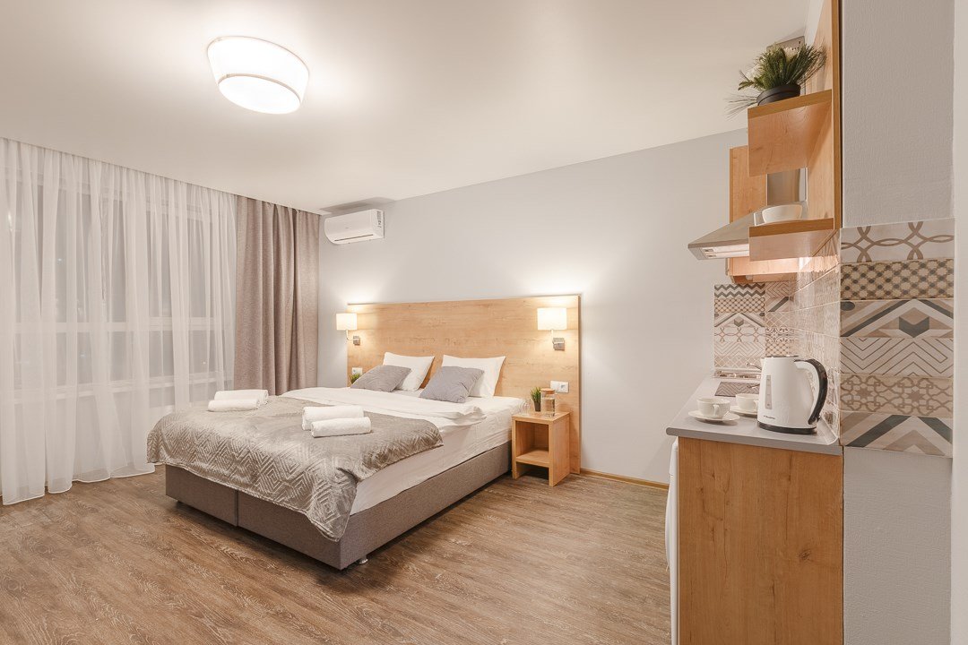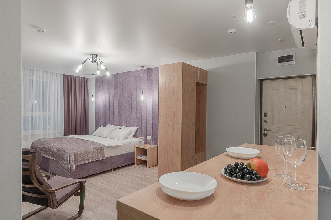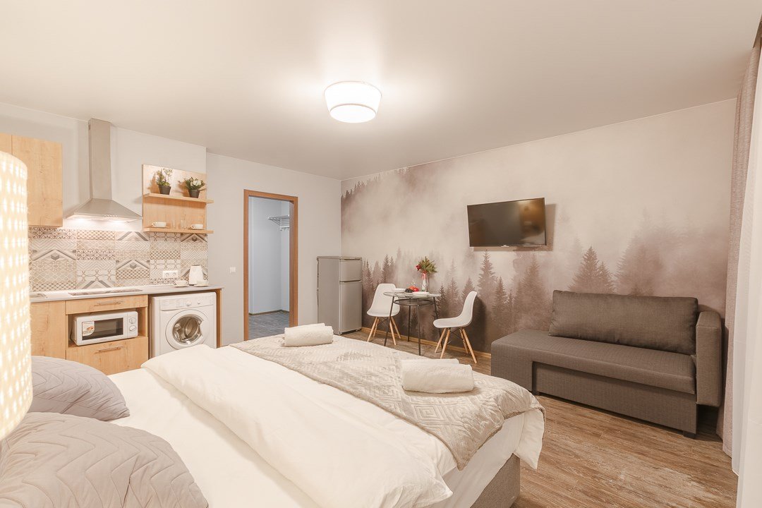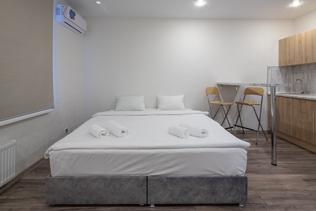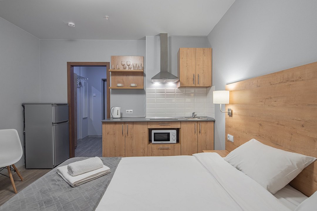 Номера категории “Апартамент” отличаются друг от друга, так как ремонт и оснащение не стандартизировано в данной категории номеров. Номер вмещает до двух гостей, оборудован диваном или двуспальной кроватью (уточняйте у администратора), телевизором с ТВ-приставкой, набором постельного белья, а также стиральной машиной и гладильными принадлежностями. В ванной комнате имеются средства личной гигиены, ванна или душевая кабина, туалет, фен и полотенца, а также бойлер для нагрева воды в период отсутствия горячей воды. Для самостоятельного приготовления еды и напитков предусмотрена собственная кухня, где установлены электрический чайник и микроволновая печь, плита и холодильник, обеденный стол со стульями и кухонными приборами.Услуги и удобства