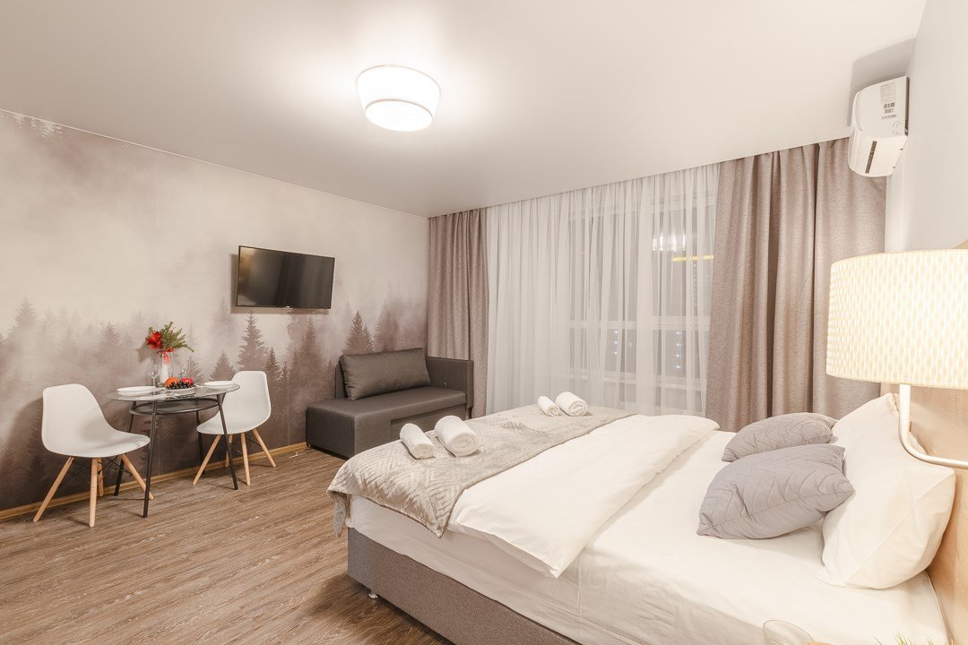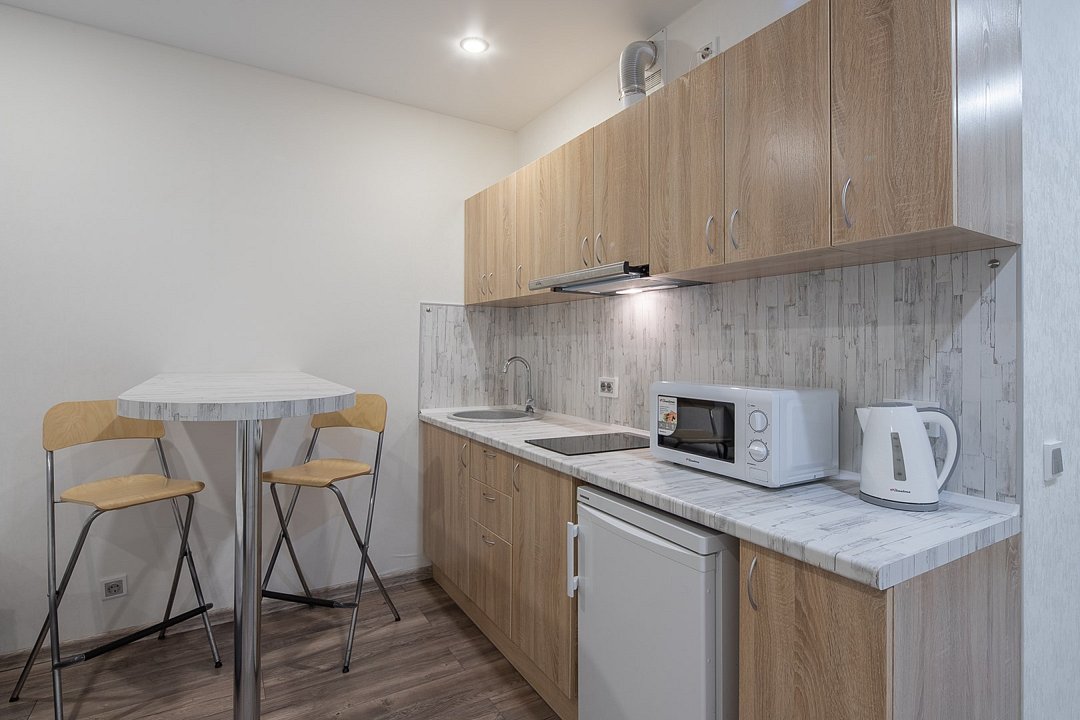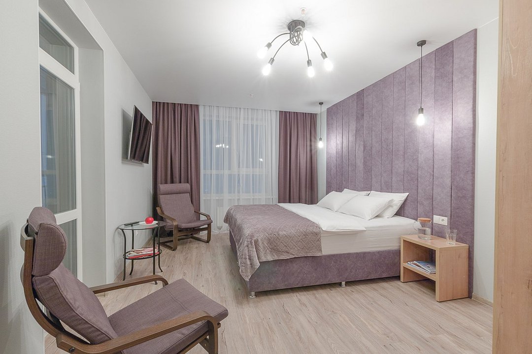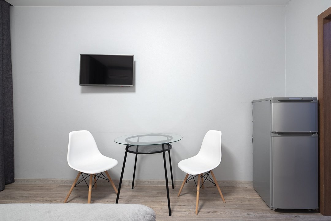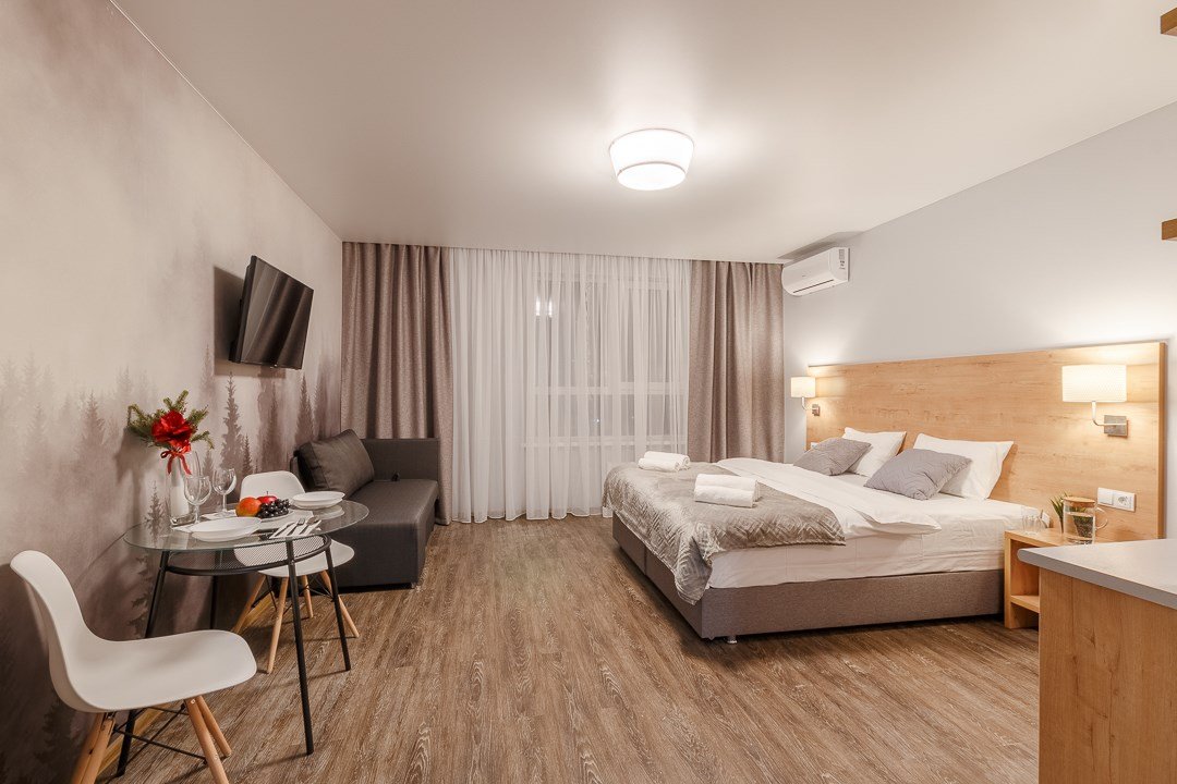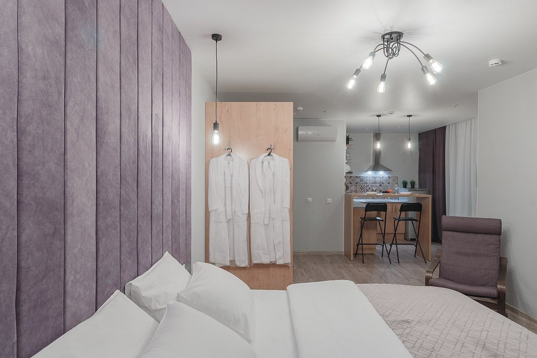Номера категории “Апартамент” отличаются друг от друга, так как ремонт и оснащение не стандартизировано в данной категории номеров. Номер вмещает до двух гостей, оборудован диваном или двуспальной кроватью (уточняйте у администратора), телевизором с ТВ-приставкой, набором постельного белья, а также стиральной машиной и гладильными принадлежностями. В ванной комнате имеются средства личной гигиены, ванна или душевая кабина, туалет, фен и полотенца, а также бойлер для нагрева воды в период отсутствия горячей воды. Для самостоятельного приготовления еды и напитков предусмотрена собственная кухня, где установлены электрический чайник и микроволновая печь, плита и холодильник, обеденный стол со стульями и кухонными приборами.Услуги и удобства