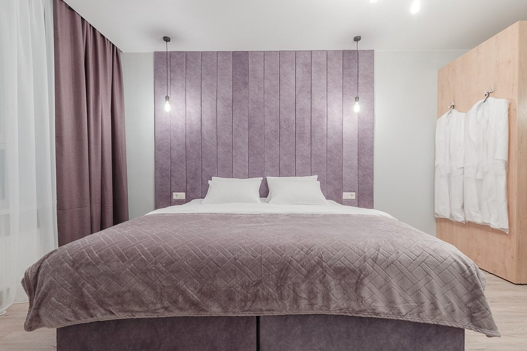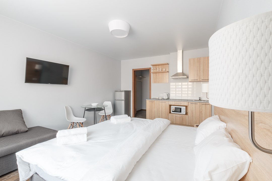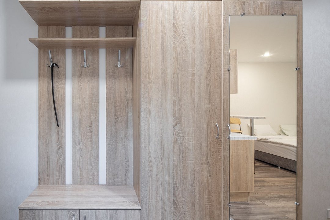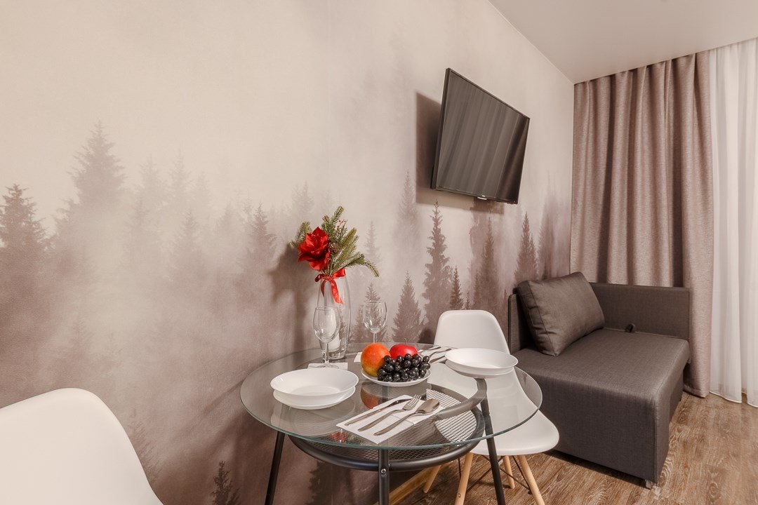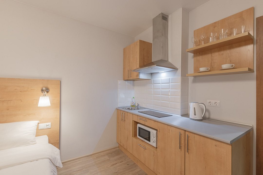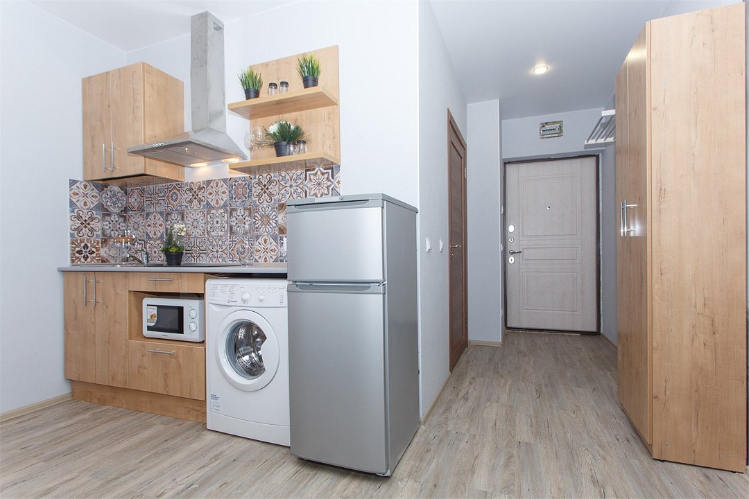 Номера категории “Апартамент” отличаются друг от друга, так как ремонт и оснащение не стандартизировано в данной категории номеров. Номер вмещает до двух гостей, оборудован диваном или двуспальной кроватью (уточняйте у администратора), телевизором с ТВ-приставкой, набором постельного белья, а также стиральной машиной и гладильными принадлежностями. В ванной комнате имеются средства личной гигиены, ванна или душевая кабина, туалет, фен и полотенца, а также бойлер для нагрева воды в период отсутствия горячей воды. Для самостоятельного приготовления еды и напитков предусмотрена собственная кухня, где установлены электрический чайник и микроволновая печь, плита и холодильник, обеденный стол со стульями и кухонными приборами.Услуги и удобства