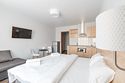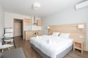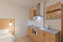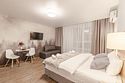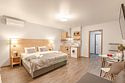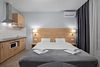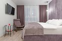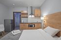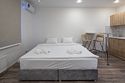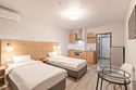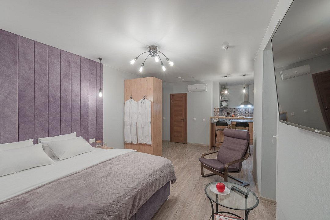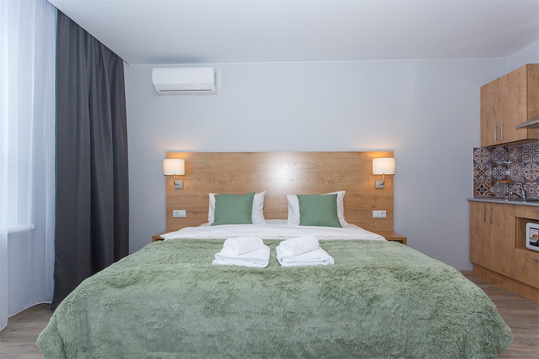 Большой номер с видом на 2 стороны. В номере имеется двуспальная кровать, большой телевизор с плоским экраном и ТВ приставкой на 160 каналов, барная стойка с двумя стульями, большой шкаф для одежды. Номер оснащен кухней с комплектом посуды и всей бытовой техникой (холодильник с морозильной камерой, микроволновая печь, электрическая печь, чайник, стиральная машина). Предоставляется бесплатный Wi-Fi. В ванной комнате установлена душевая кабина с тропическим душем. Имеется фен и одноразовые гигиенические принадлежности (зубной набор, шампунь, гель для душа, мыло). Номер комплектуется постельным бельем и полотенцами. В летний период работает кондиционер.Услуги и удобства