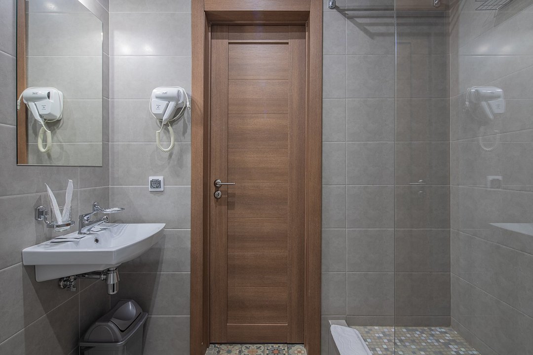 Номер вмещает до трёх гостей, оборудован двуспальной кроватью и одноместным диваном, телевизором с ТВ-приставкой, кондиционером, набором постельного белья, а также стиральной машиной и гладильными принадлежностями. В ванной комнате имеются средства личной гигиены, душевая кабина, туалет, фен и полотенца, а также бойлер для нагрева воды в период отсутствия горячей воды. Для самостоятельного приготовления еды и напитков предусмотрена собственная кухня, где установлены электрический чайник и микроволновая печь, плита и холодильник, обеденный стол со стульями и кухонными приборами.Услуги и удобства