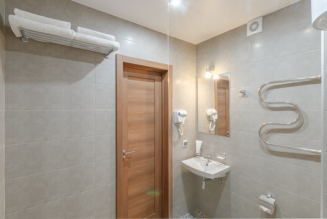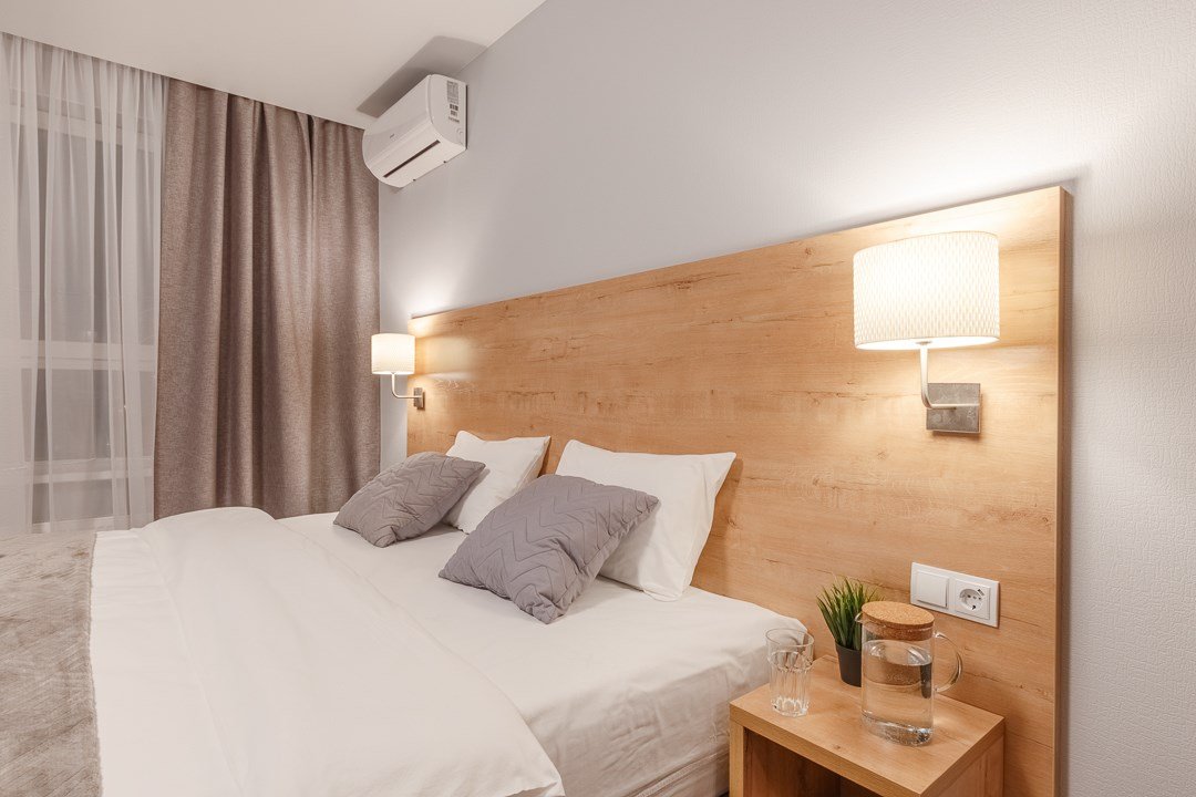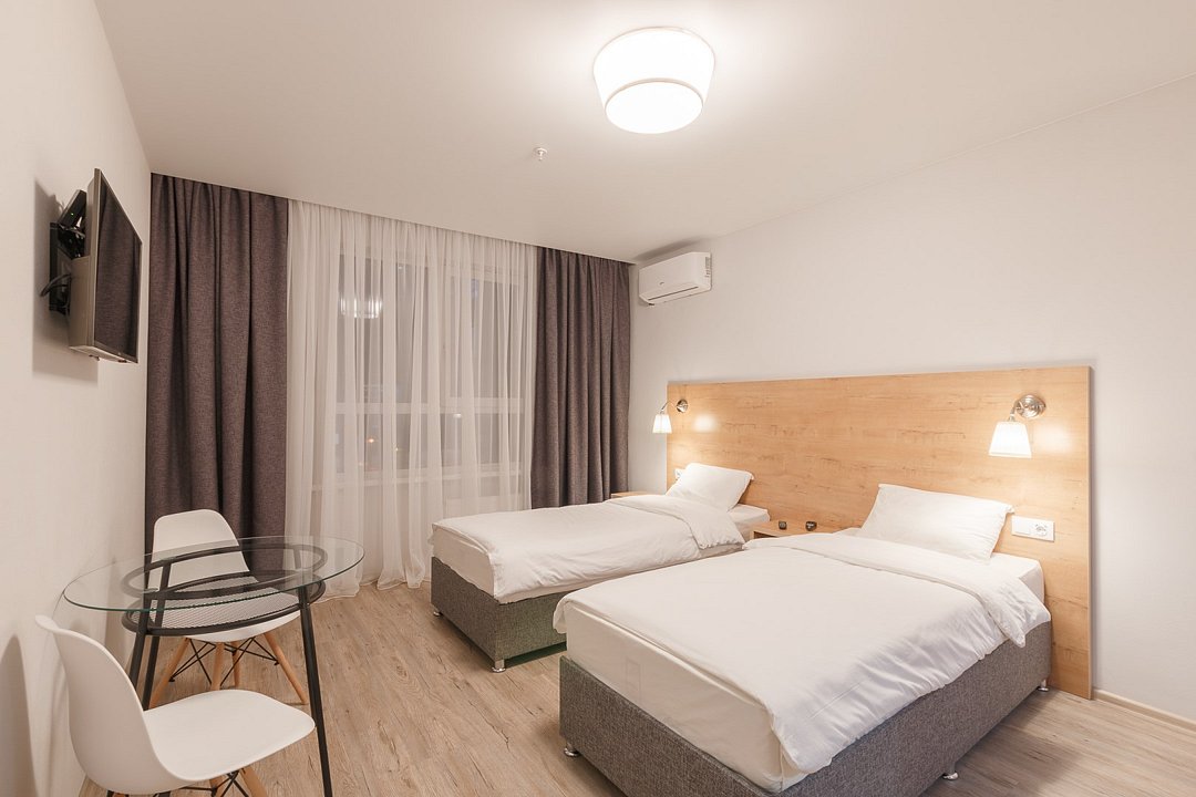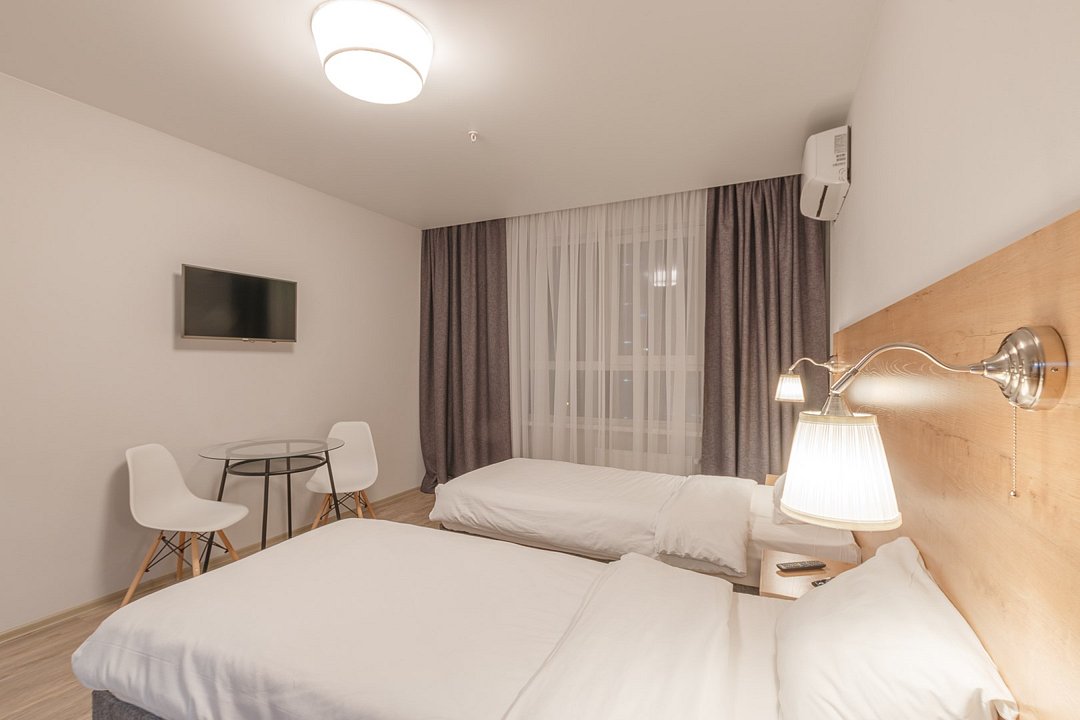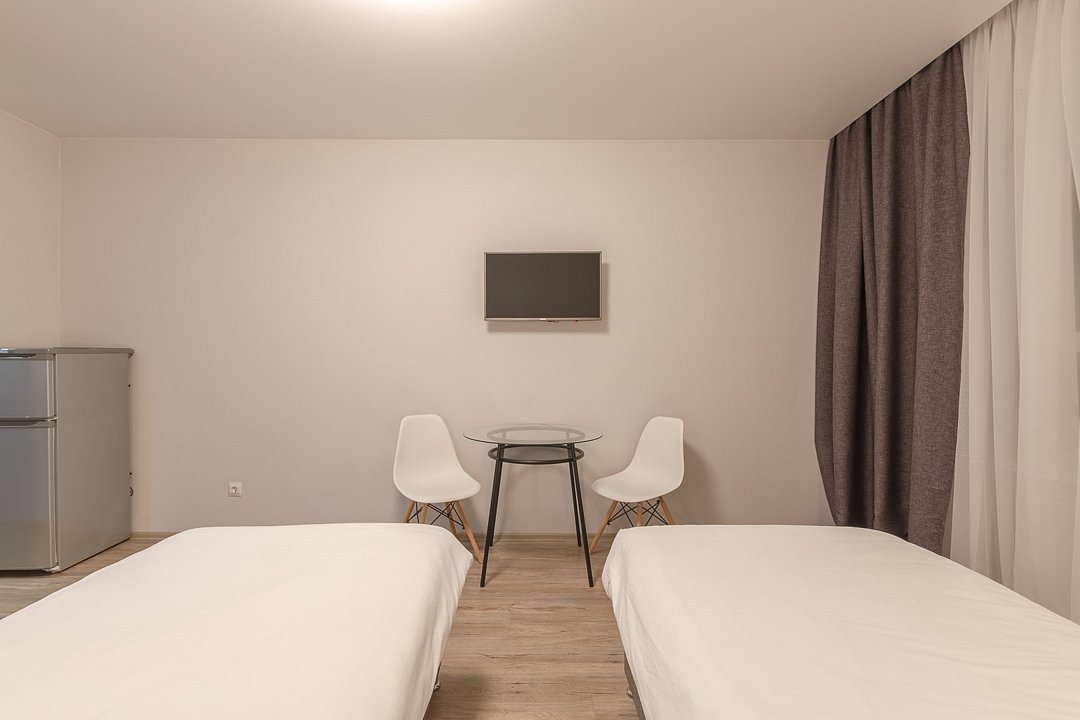Wi-Fi, интернет, холодильник, кондиционер, светильник, фен, плита для приготовления пищи, микроволновая печь, ванная комната, душевая кабина, санузел, водонагреватель, гигиенические средства, две односпальные кровати, гладильная доска, тумбы, стулья, шкаф для одежды, вешалки, обеденный стол, зеркало, кухня, чайный набор, набор посуды, стиральная машина, чайник, унитаз, раковина, отопление, душ, вид на город, кухонная посуда, стаканы, кухонная утварь, столовые приборы, туалетные средства, туалет, цифровое тв, диван-кровать, раскладной диван, телевизор с плоским экраном, номер для некурящих, usb портВ номере
