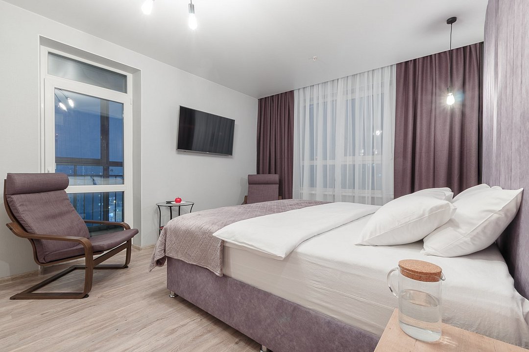 Wi-Fi, интернет, холодильник, кондиционер, светильник, фен, плита для приготовления пищи, микроволновая печь, ванная комната, душевая кабина, санузел, водонагреватель, гигиенические средства, балкон, кровать «Queen size», гладильная доска, кресла, тумбы, стулья, шкаф для одежды, вешалки, журнальный столик, барная стойка, кухня, чайный набор, набор посуды, стиральная машина, чайник, унитаз, раковина, отопление, душ, вид на город, кухонная посуда, стаканы, кухонная утварь, столовые приборы, туалетные средства, туалет, цифровое тв, телевизор с плоским экраном, телевизор со Smart TV, номер для некурящих, usb портВ номере