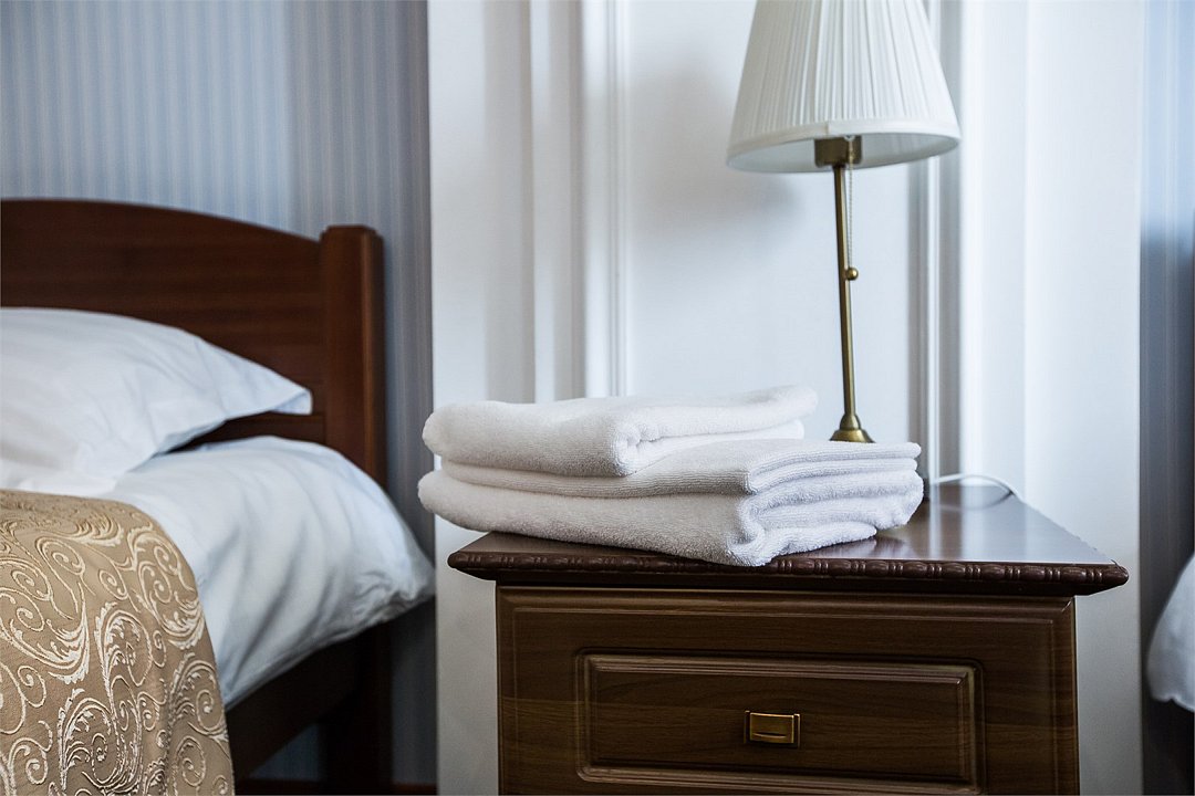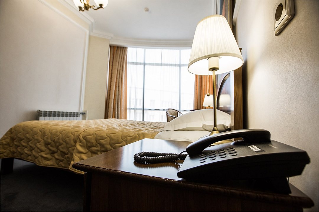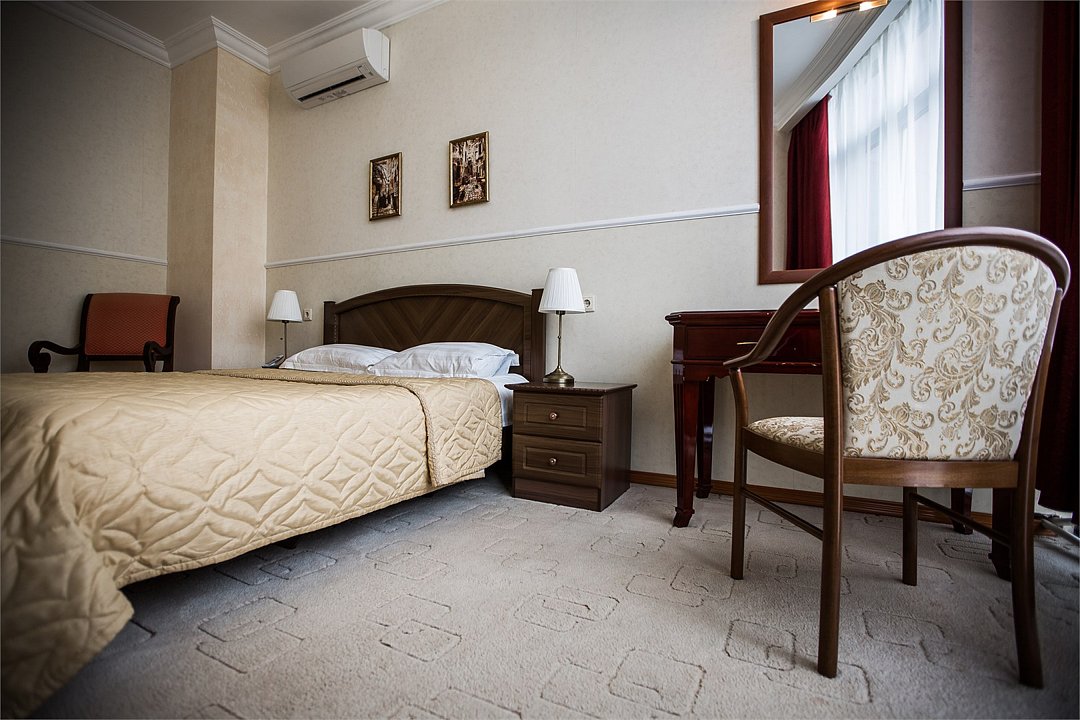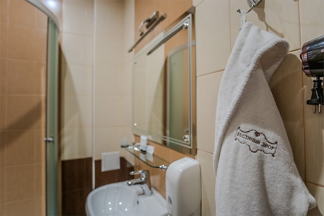 Стандартные одноместные гостиничные номера предназначены для спокойного отдыха. Удобства одноместного номера в гостинице «Гостиный Двор» Кондиционер, телевизор и холодильник. Душ и туалет в номере. Гигиенические принадлежности, халат и тапочки. Одноместные номера в гостинице «Гостиный Двор» оформлены в мягких, пастельных тонах. В каждом предусмотрен маленький столик-тумбочка для работы, макияжа или вечерней чашечки кофе.Услуги и удобства
