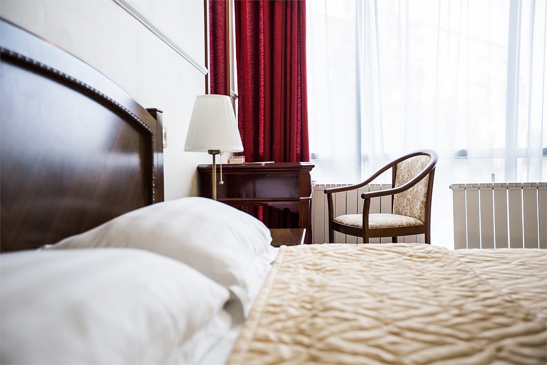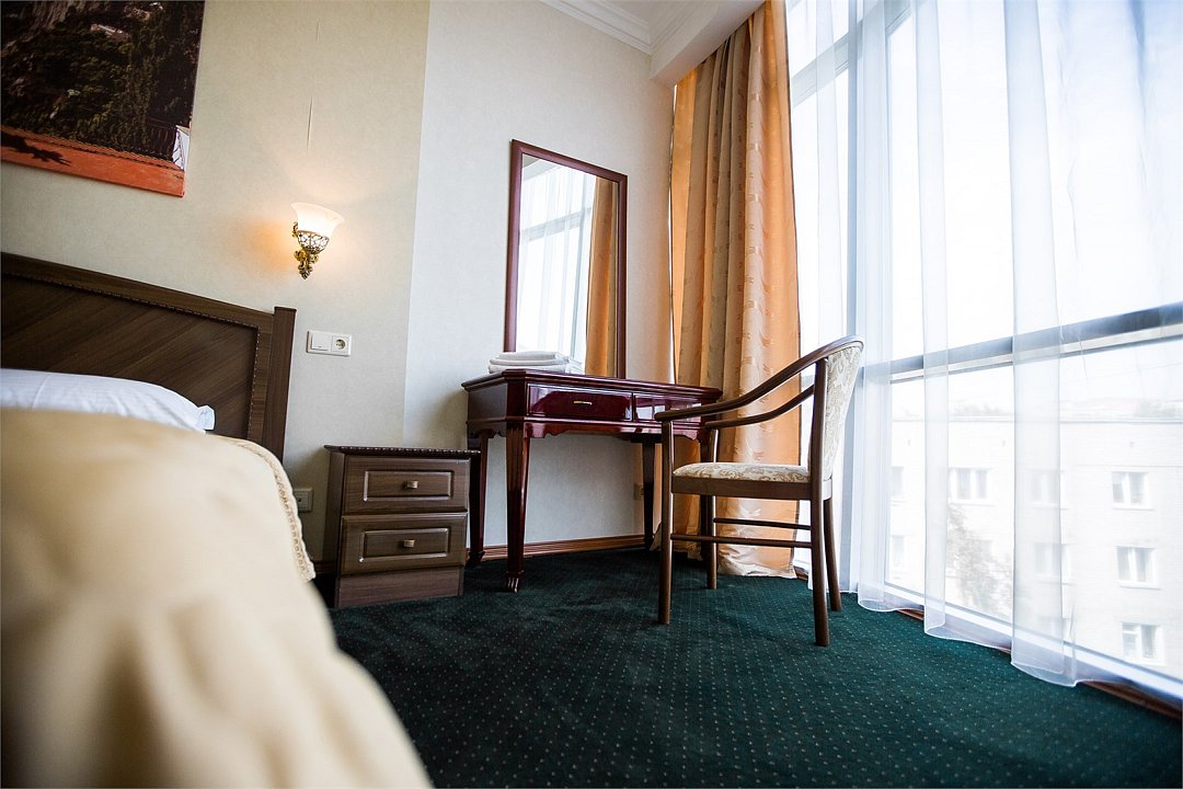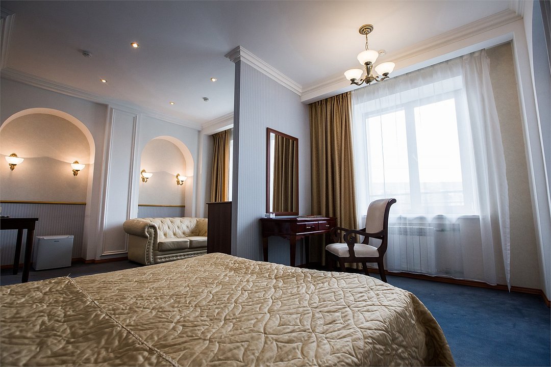 С одной большой кроватью оборудованы по международному стандарту. Удобства номеров «Люкс» в гостинице Душ и туалет — просторные комнаты с современной сантехникой. Предоставляются туалетные принадлежности, личный халат и тапочки. Телевизор, телефон, кондиционер и холодильник в номере. На территории отеля есть Wi-Fi. Большой шкаф-гардероб, в котором легко поместятся все ваши вещи. Гостиная с мягким уголком — для отдыха и встречи гостей. В номерах «Люкс» есть застекленные балконы, из которых открывается прекрасный вид на парковую зону Новосибирска.Услуги и удобства