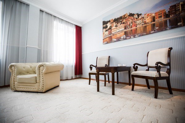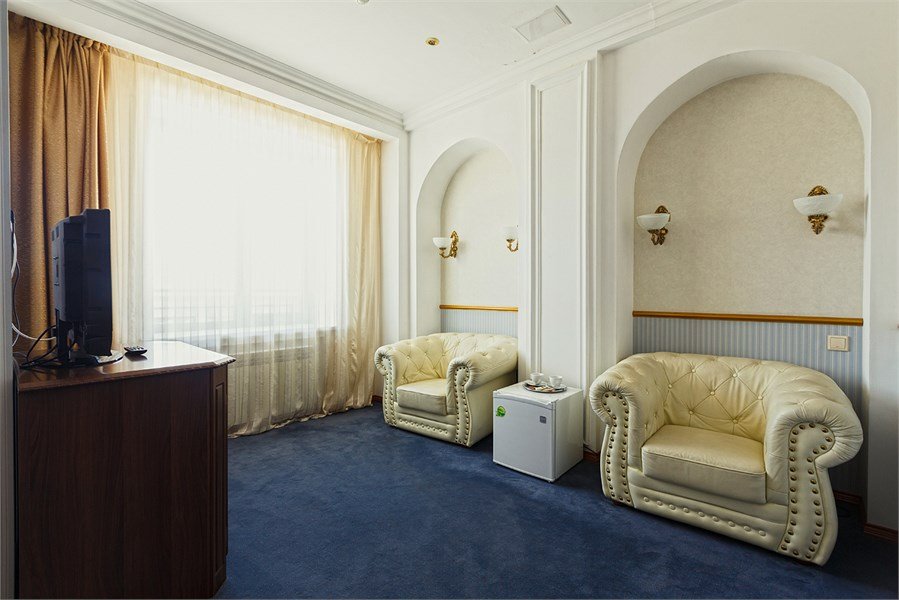 телевизор, Wi-Fi, телефон, холодильник, кондиционер, фен, ванная комната, ванна или душевая кабина, санузел, халаты, банные полотенца, тапочки, гигиенические средства, двуспальная кровать, кресла, шкаф для одежды, письменный стол, зеркало, чайный набор, обслуживание номеров, гостиная зона, ковровое покрытие, вид на город, кулер на этаже, без питомцевВ номере