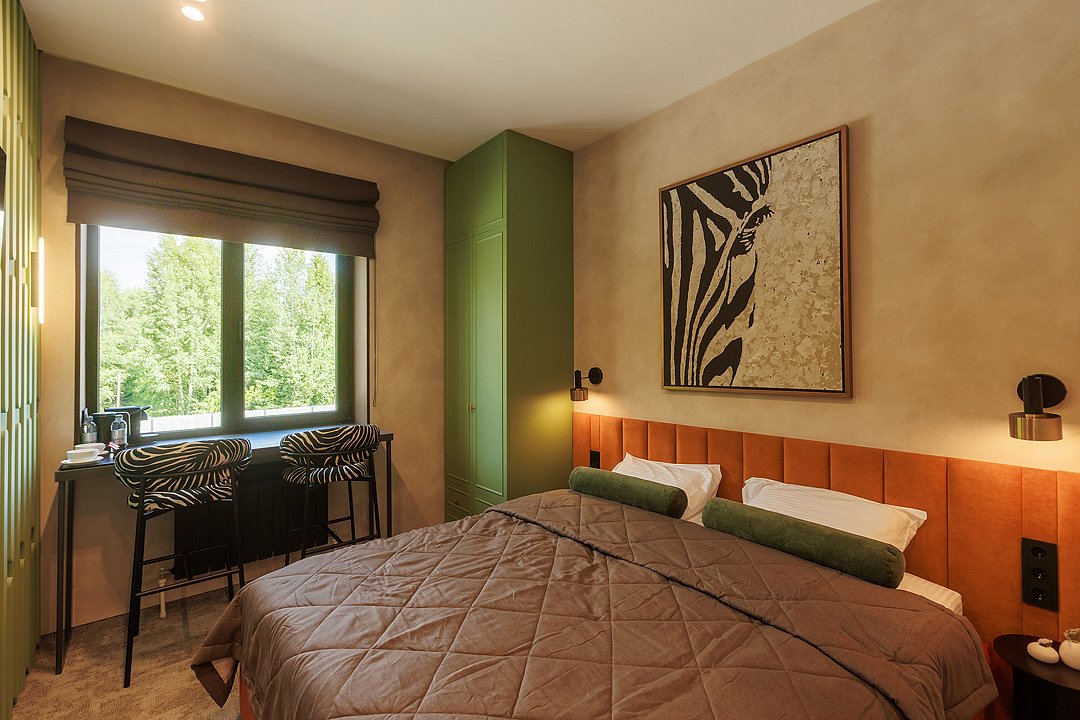 Номер категории «Стандарт», интерьер которого вдохновлён эстетикой pop-up арта, но при этом удивительно мягок, естественен и уютен.