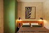 Каждая деталь — от фактурной отделки стен до графичного искусства на стене — продумана, но не перегружена, позволяя пространству «дышать». Комната будто обнимает теплом — за счёт уютного текстиля, тёплого освещения и тщательно выверенной цветовой композиции.