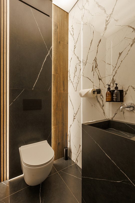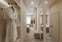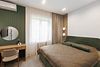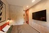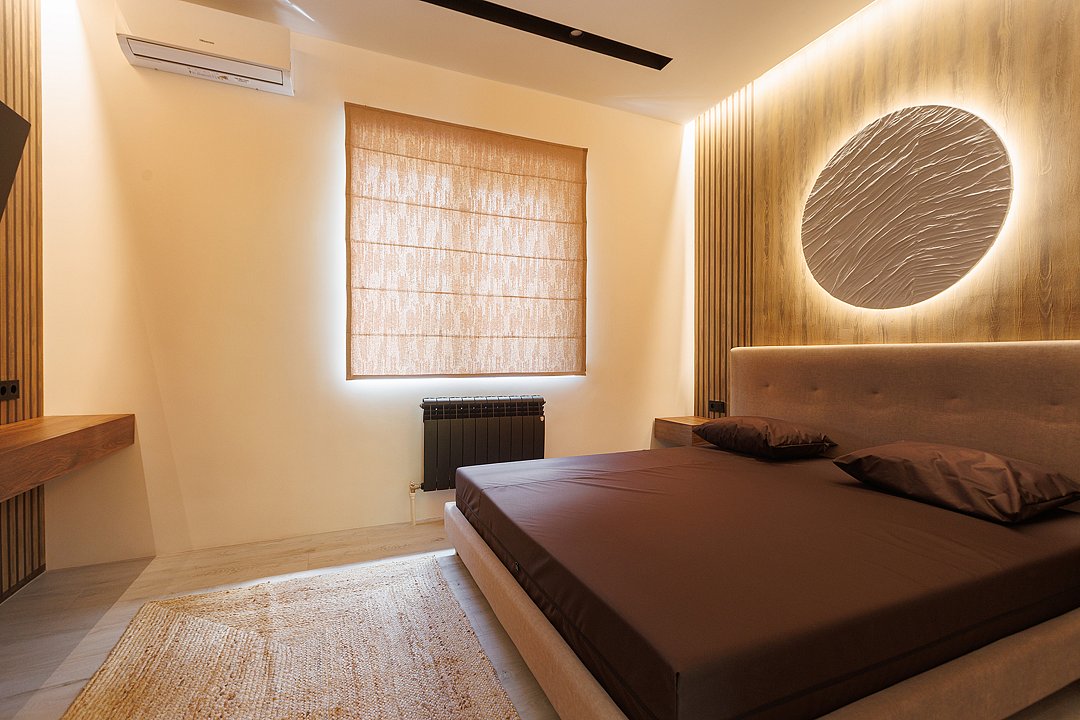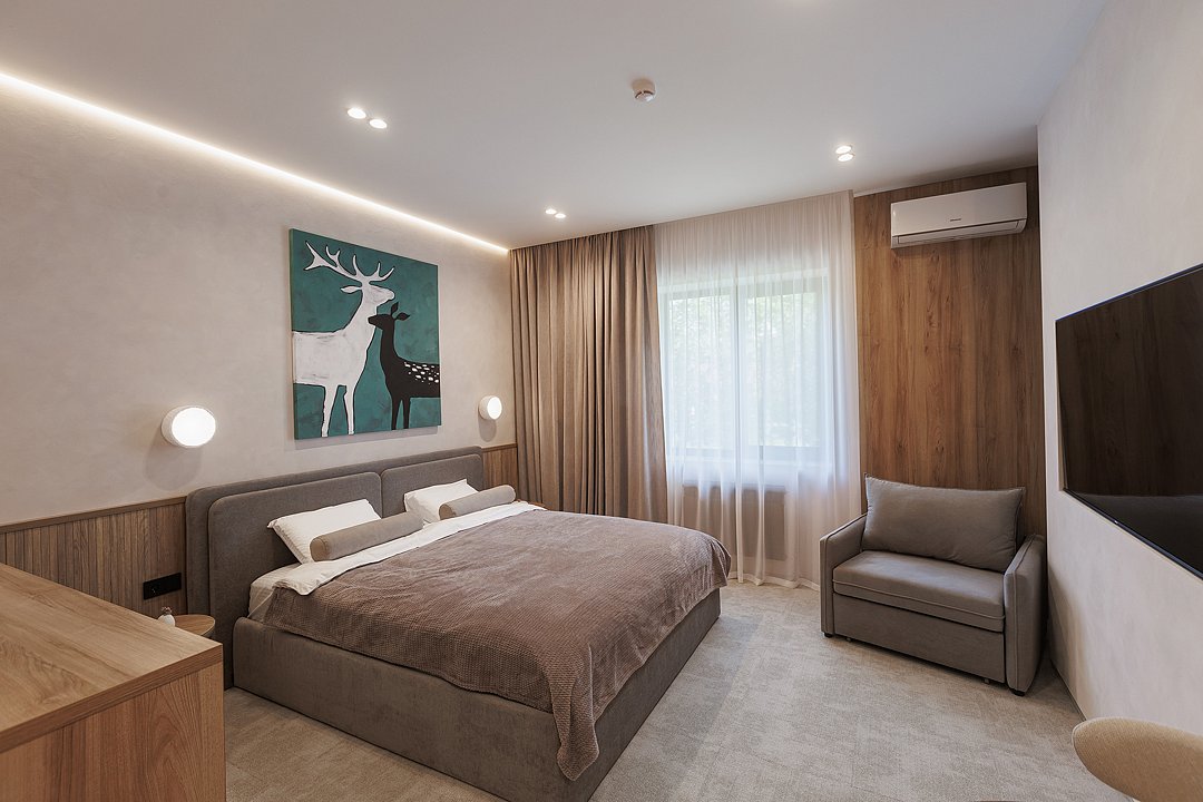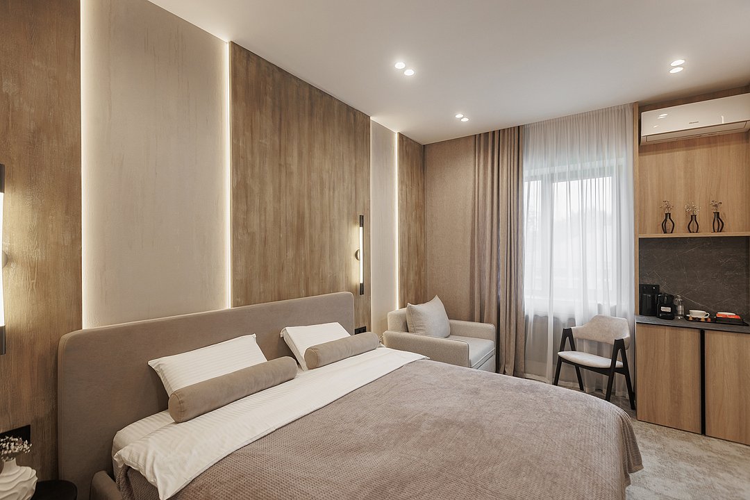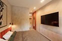 Во второй комнате — спальне — царит ощущение покоя и уединения. Большая кровать с мягким изголовьем, приглушённый свет, тёплые текстуры и деликатные оттенки — всё это создаёт пространство, в котором хочется задержаться, выключить телефон и просто отдыхать.
