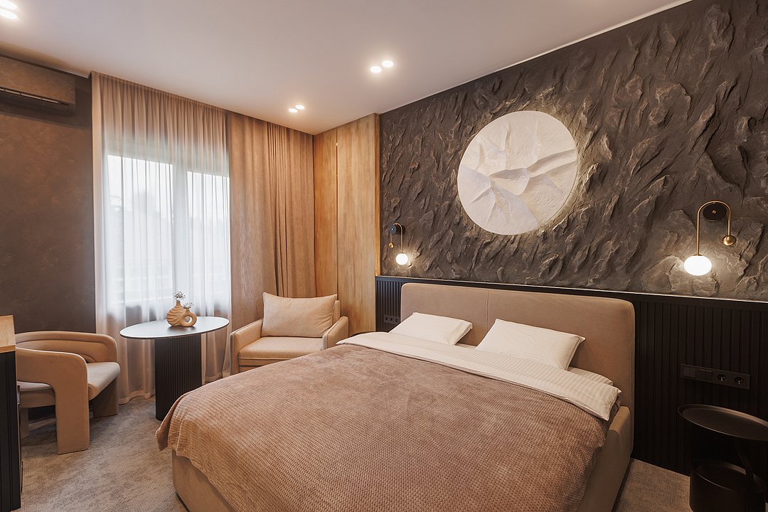 Он окутан загадочной атмосферой: тёмные, насыщенные оттенки интерьера создают ощущение защищённости и камерности, а акцентная стена за кроватью, напоминающая массив горной породы, привносит в номер силу и величие природы. Дополняют интерьер детали ручной работы.