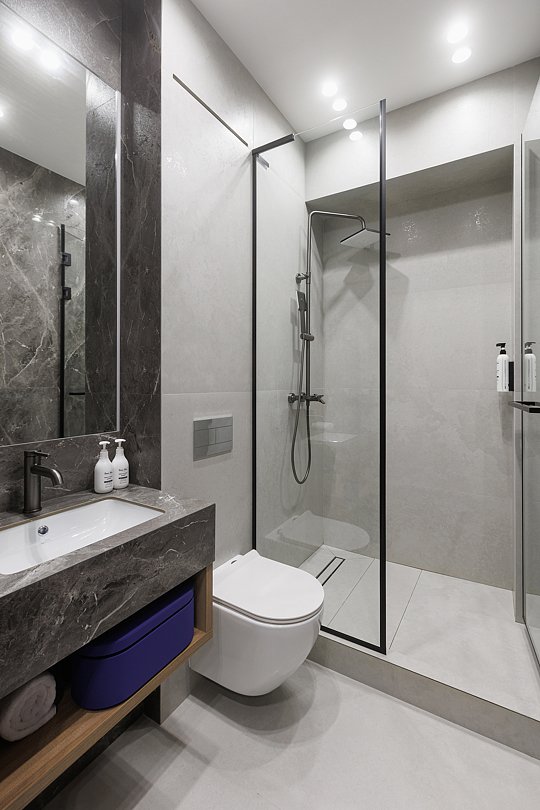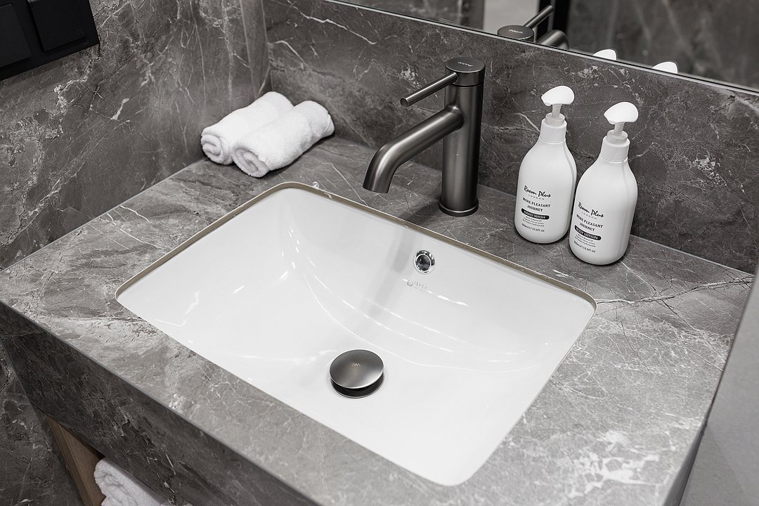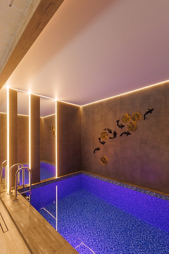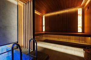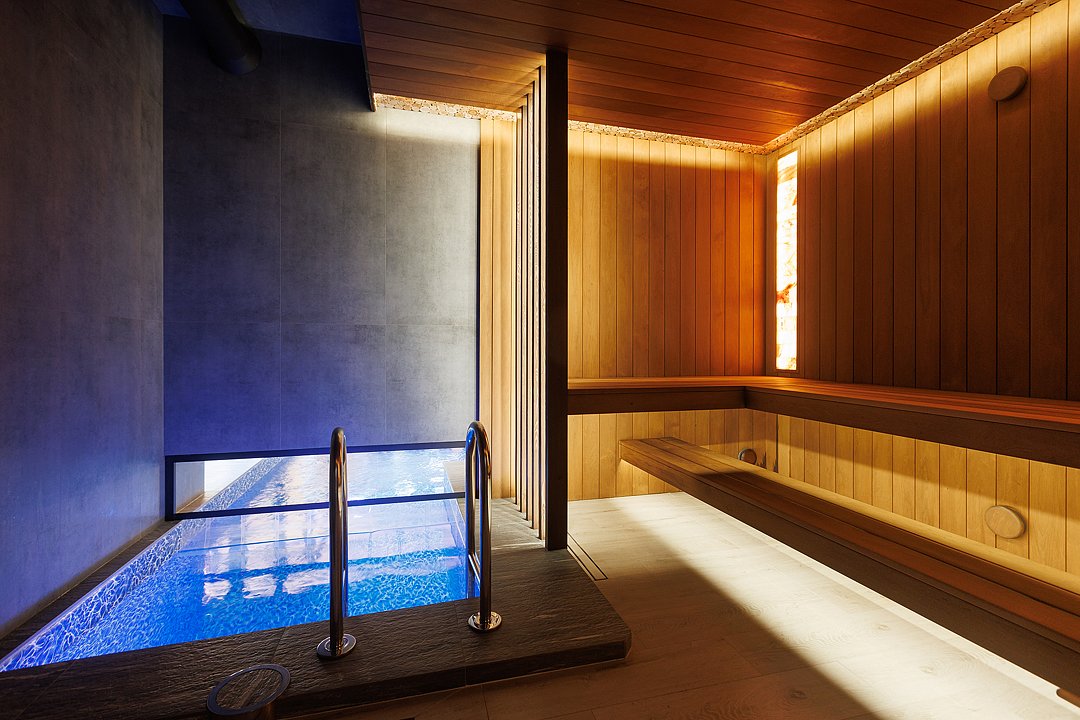 Финская сауна в номере — единственная в комплексе. Она предназначена для глубокого прогрева, без парения веником, чтобы сосредоточиться на тишине, тепле и уединении. А после, расслабиться в фурако, наполненном горячей водой и уютом или бассейном внутри номера, который становится не просто элементом SPA, а частью общей дизайнерской концепции, подчеркивающей синергию воды и камня.