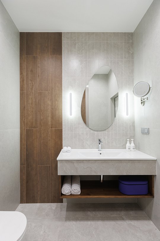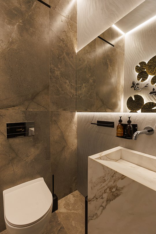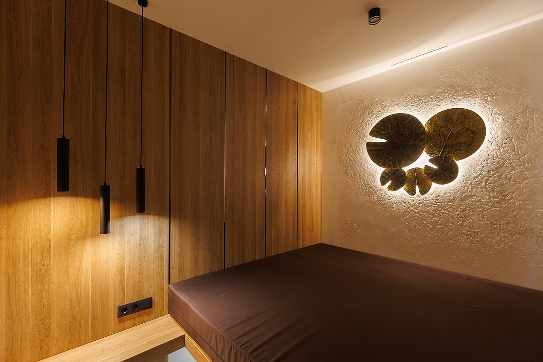 Читать полностьюИгра стихий, в которой природа превращается в искусство. Номер «ROCO» — это настоящая ода земле и воде. Главная стена, напоминающая сруб скалы, придаёт пространству первозданную силу и монументальность, а природные мотивы и ручная работа превращают номер в уникальное место отдыха, где каждая деталь наполнена смыслом. Особое внимание привлекают интерьерные акценты с изображением рыбок и кувшинок, они ненавязчиво сопровождают вас во всех зонах — от бассейна до спальни и санузла. Эти элементы придают интерьеру поэтичность и живость, создавая ощущение, будто вы находитесь в подводном оазисе.