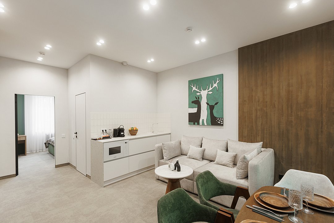 Главная комната встречает уютной гостиной зоной с диваном-кроватью, который вечером легко превращается в комфортное дополнительное спальное место на двоих. Это решение делает номер идеальным для семей с детьми или небольшой компанией друзей.