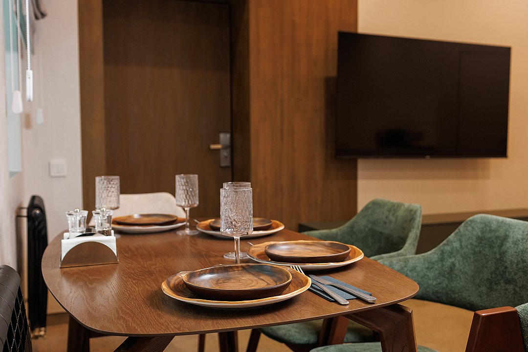 Номер включает отдельную кухонную зону, что редкость даже для люксовых отелей. Это полноценное пространство, где можно подогреть детскую еду или устроить завтрак всей семьёй. Кухня оформлена в едином стиле с номером: лаконично, тепло, функционально и красиво.