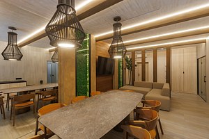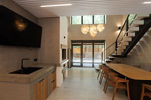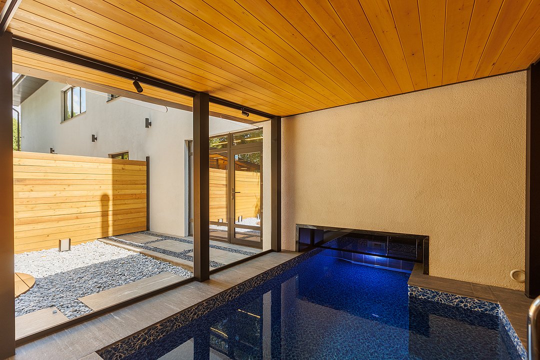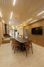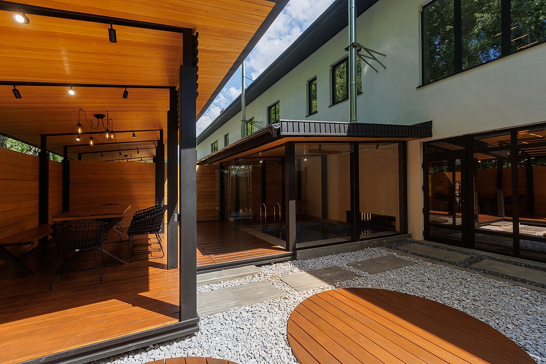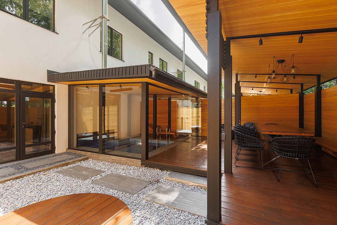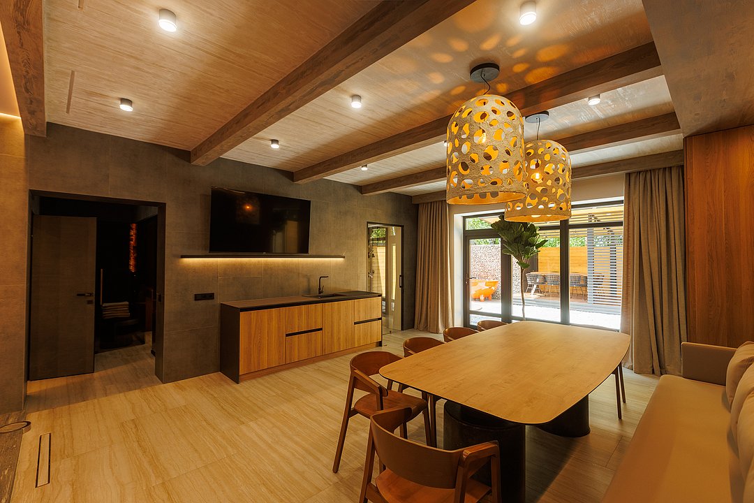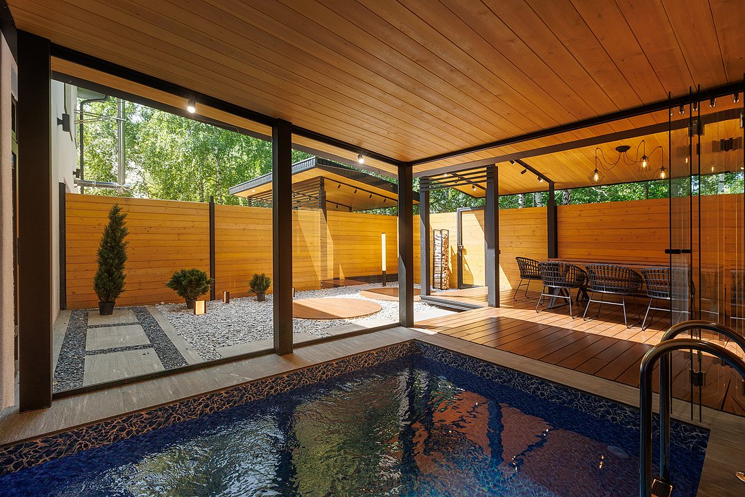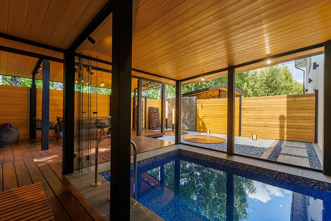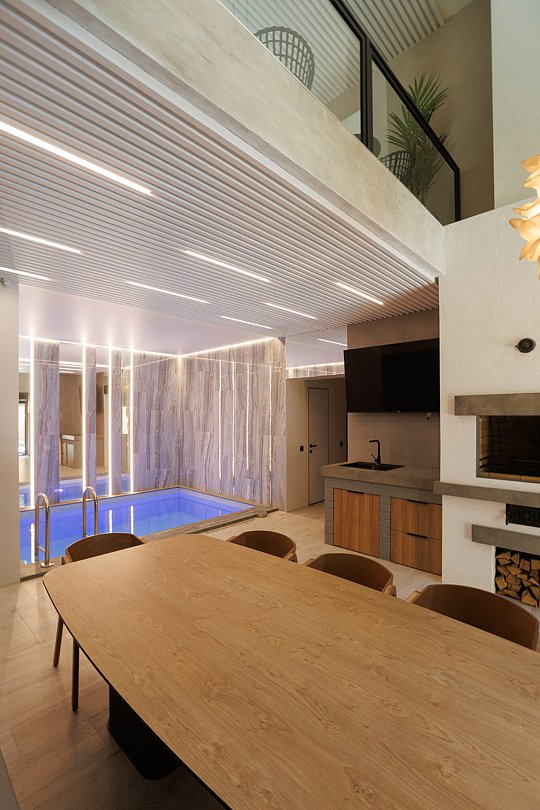 На первом этаже вас встречает гостиная с камином, уютная и стильная, для неспешных разговоров и полного расслабления. Здесь же внутренний бассейн и большой стол. Русская парная с видом на улицу оборудована эксклюзивной печью Everest и парящими полками из термо ольхи и можжевельника — парение здесь превращается в настоящий ритуал.