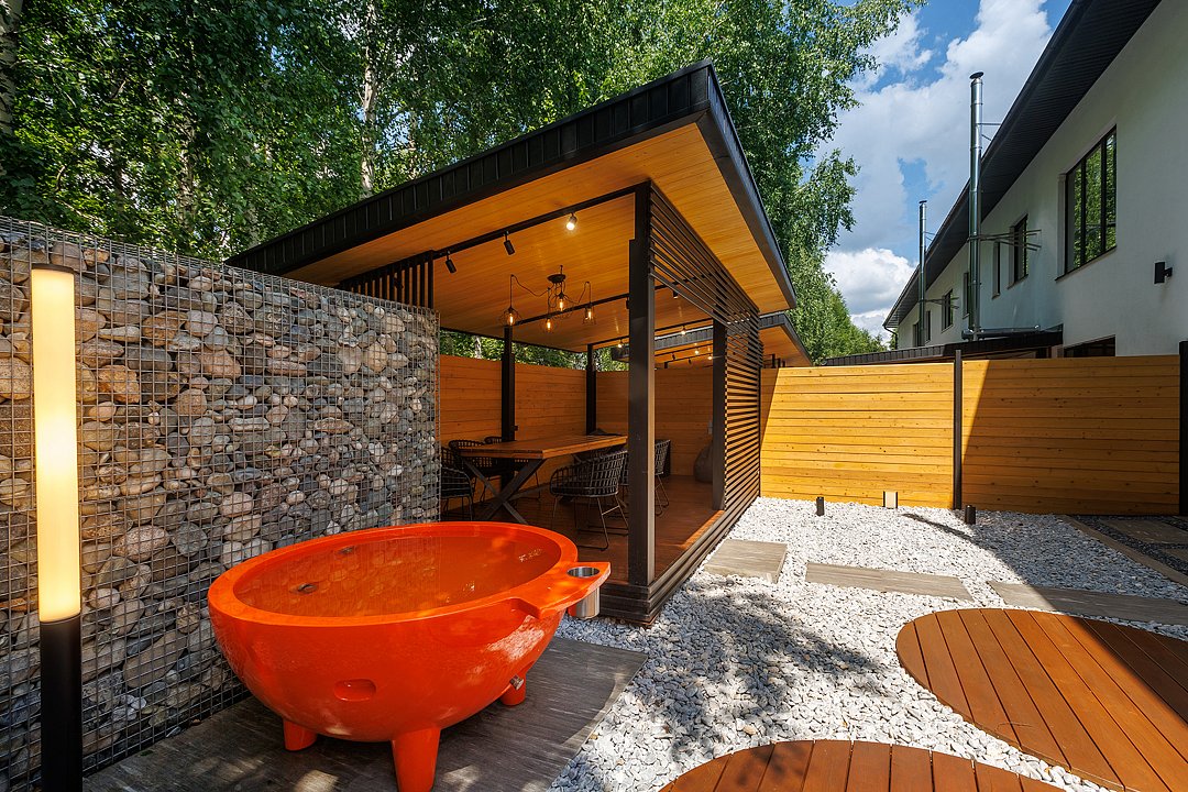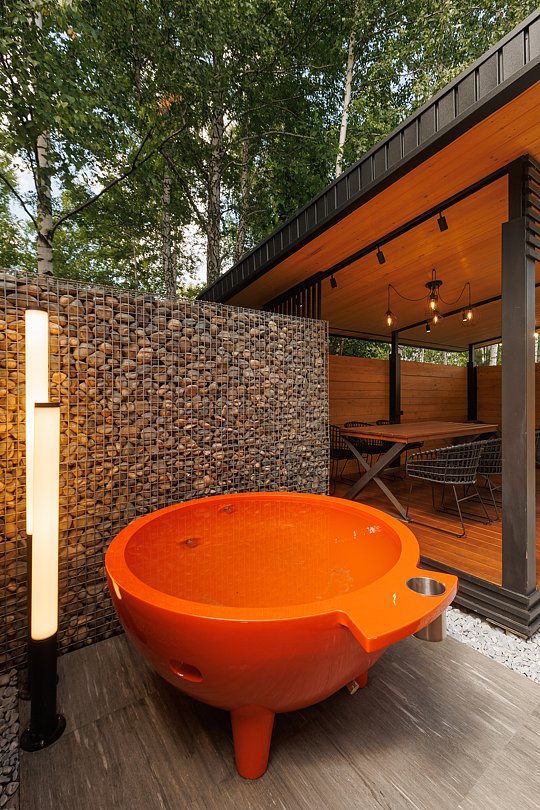 В уличной зоне отдыха — большой стол, за которым можно собраться всей компанией на свежем воздухе. При желании, накрыть стол можно и внутри помещения, создав уютную атмосферу ужина в тепле и тишине.
