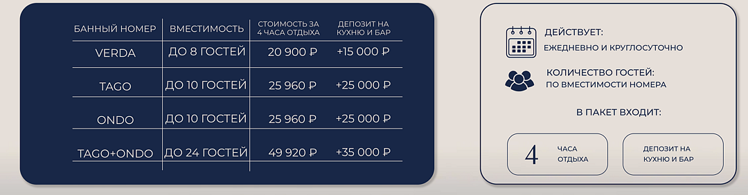 В пакет входит: 4 часа отдыха, депозит на кухню и бар, 15% скидка на бар.