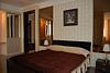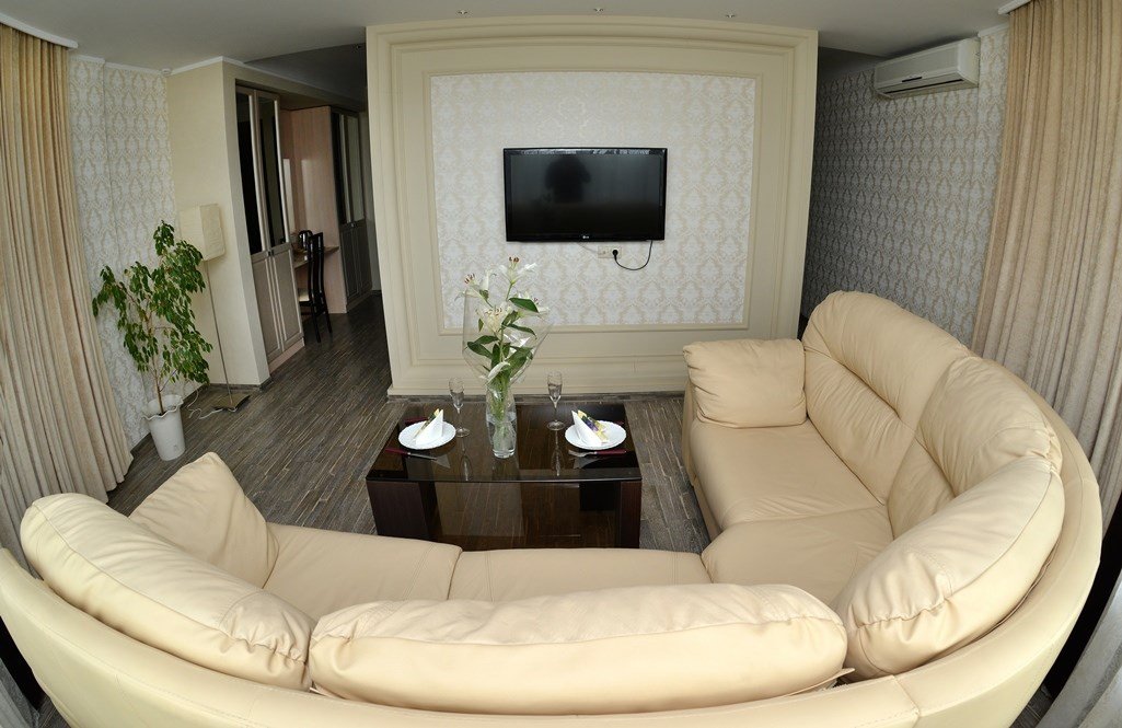 Просторный номер Разделенный фальш-стеной на две зоны: спальную и гостиную. В спальной зоне большая двуспальная кровать, в гостиной большой кожаный угловой диван с торшером и журнальным столиком.Услуги и удобства