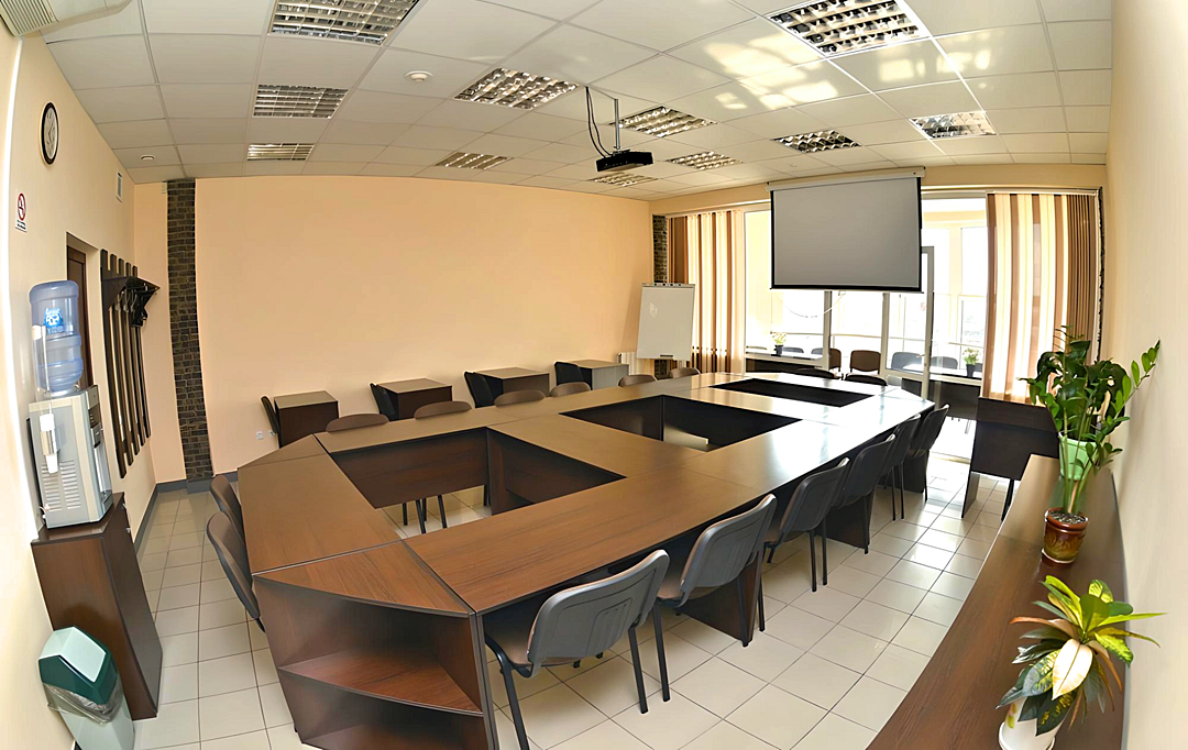 - широкоформатный проектор, экран, Wi-Fi, 3 флипчарта, ноутбук, кулер с холодной и горячей водой, cтаканчики, кондиционер, на окнах жалюзи, стол для лектора.