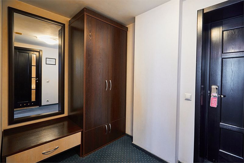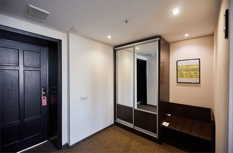 Просторный номер с удобной двуспальной кроватью и функциональной рабочей зоной. В номере предусмотрен раскладывающийся диван. Рабочая зона оборудована письменным столом со стулом и настольной лампой, а также чайной станцией. Для хранения вещей имеются две вместительные гардеробные с зеркалами в пол.