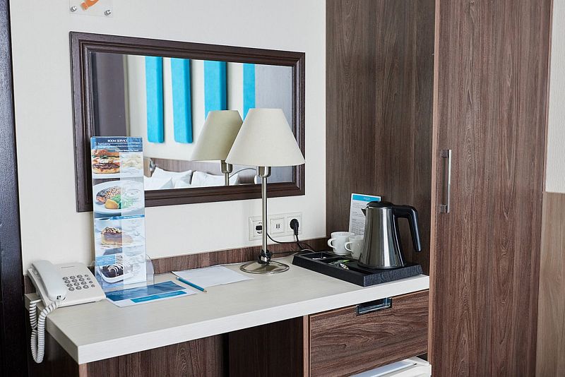 В номере есть широкоэкранный телевизор, мощный Wi-Fi, телефон и USB-розетки, что позволяет комфортно работать и отдыхать.