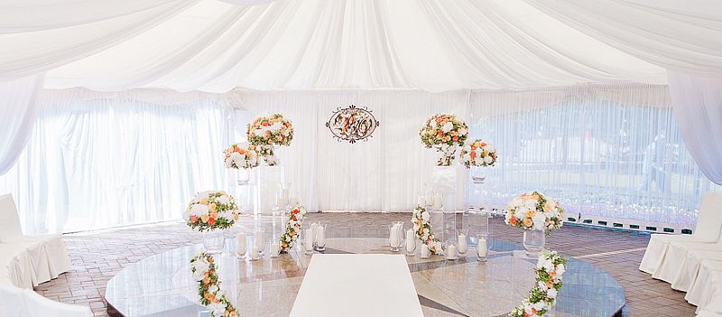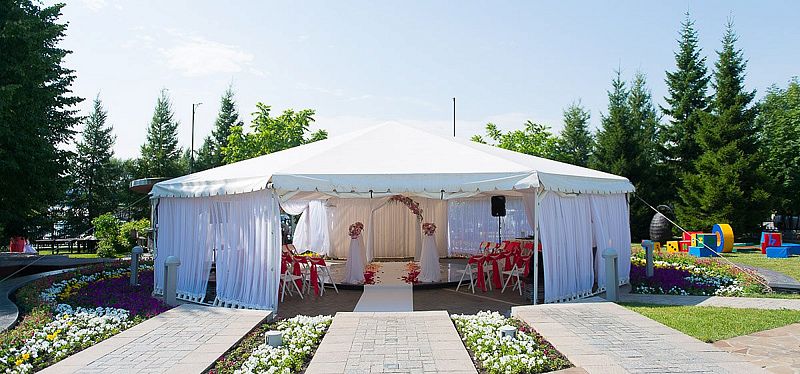 - Вместительные размеры шатра (60 м²). При банкетной рассадке помещается 40 человек, при фуршетной сервировке – 70;