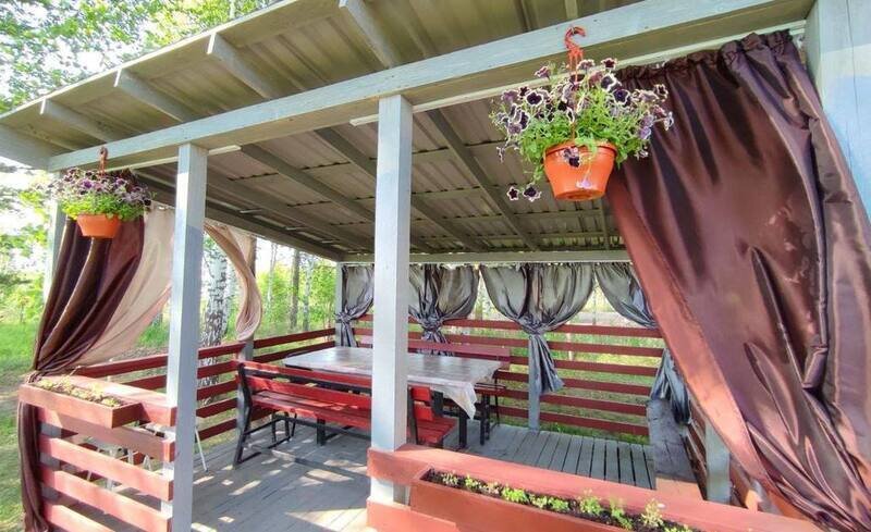 Коттедж имеет два этажа и подходит для спокойного отдыха семей или небольших компаний. На придомовом участке площадью 20 соток есть лес и газон. Здесь есть качели для двух человек и уютная беседка с столом и скамейками, а также возможность аренды мангала. Для гостей предусмотрены парковочные места для автомобилей.