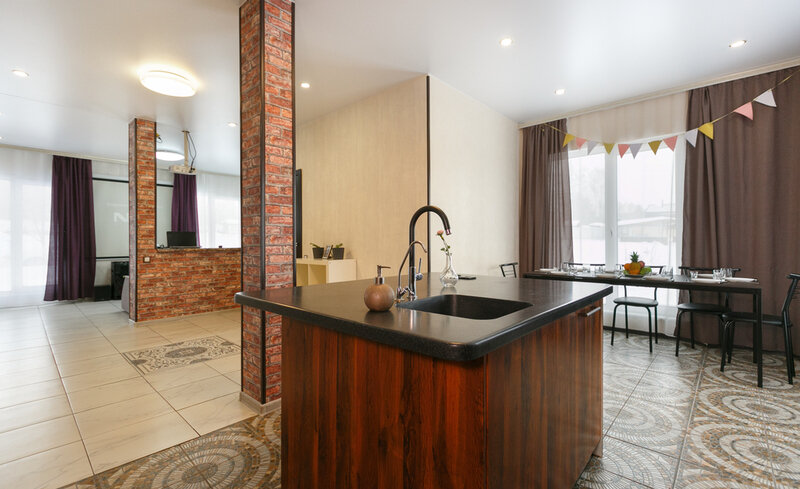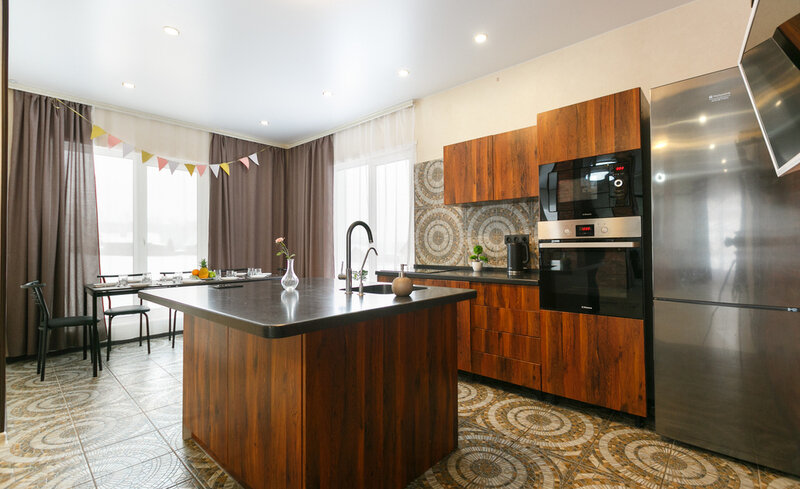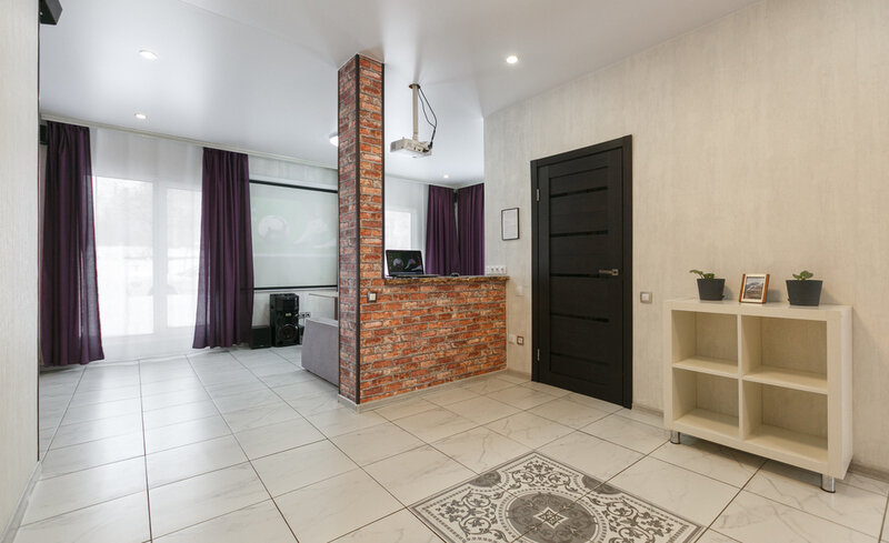 Большая кухня, зал, кабинет, душ, туалет. На полу кафель (тёплый пол). Встраиваемая техника, посудомоечная машина и т.д.