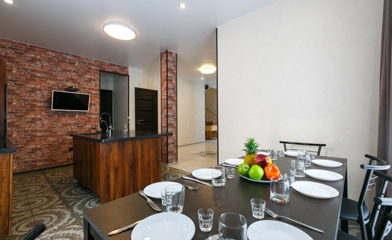 На кухне есть все необходимое оборудование ― посудомоечная машина, холодильник, варочная панель, СВЧ-печь, электрический чайник, а также набор посуды и столовых принадлежностей. Все комнаты коттеджа оснащены ЖК-телевизорами, есть караоке и кинотеатр с большим проектором. Во всех помещениях коттеджа доступен беспроводной интернет wi-fi. Также есть стиральная машина и гладильная доска с утюгом.