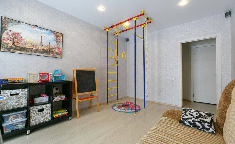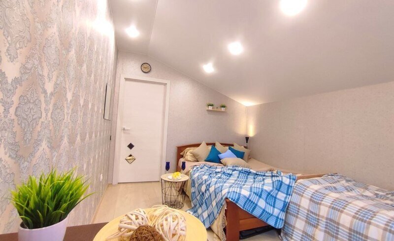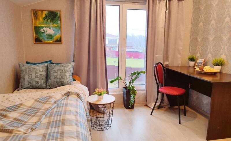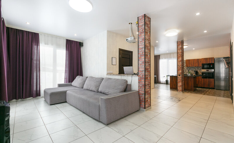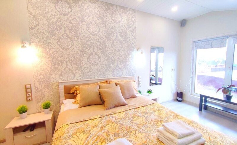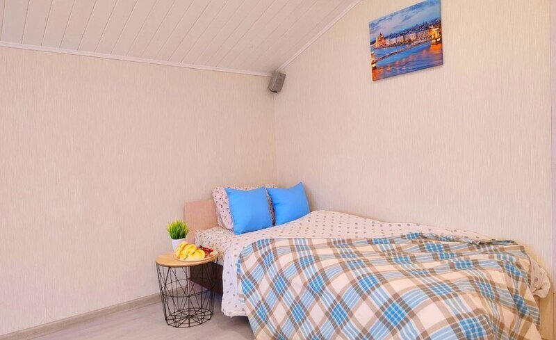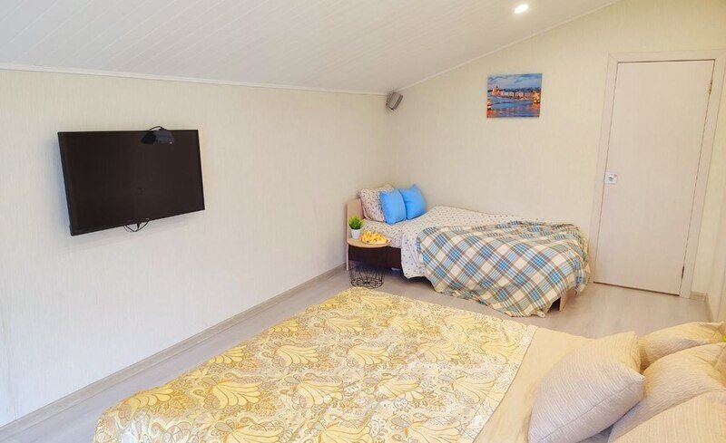 В коттедже есть 12 мест для проживания. Есть раскладывающиеся диваны, одно- и двухспальные кровати с ортопедическими матрасами. В ванной комнате есть душ, а также набор полотенец и туалетных принадлежностей. Одна из комнат предназначена для детей и имеет игрушки и спортивный настенный модуль.