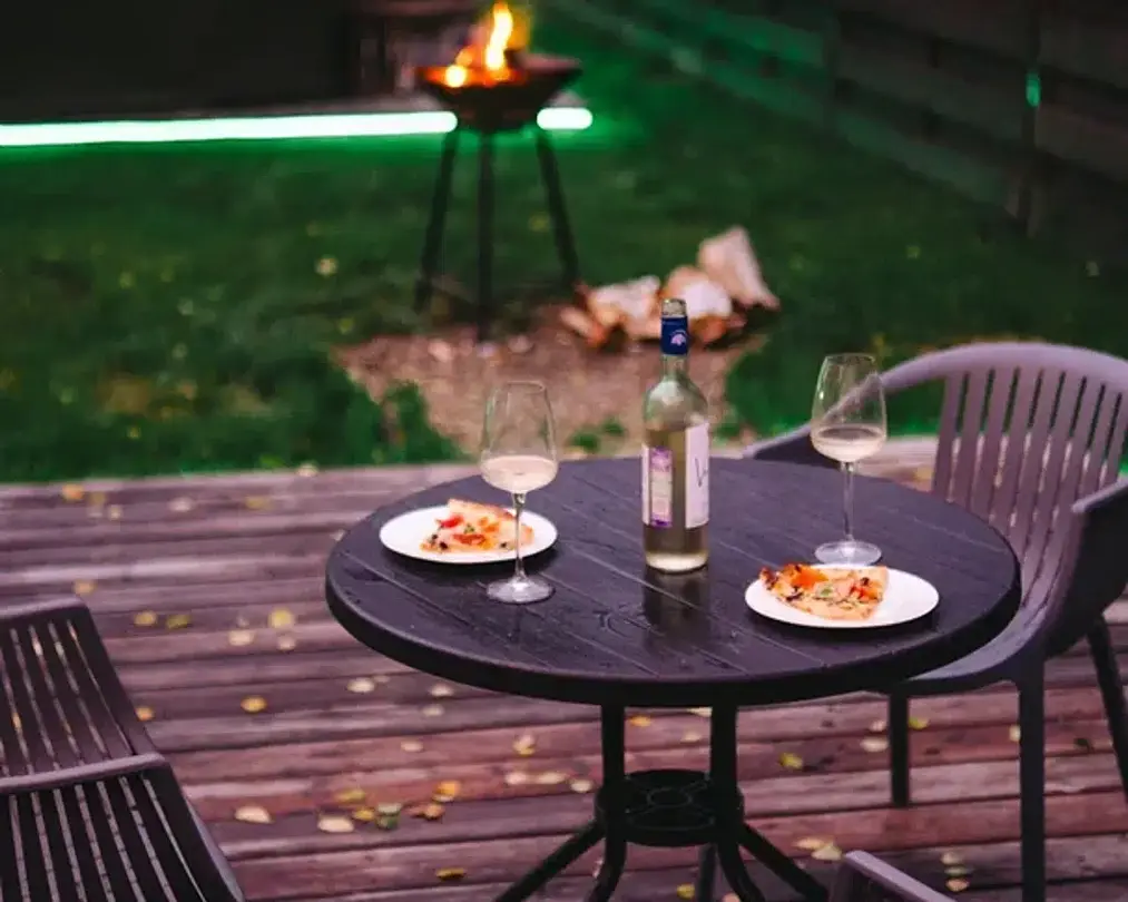 Каждый домик оборудован угольным грилем и уличной мебелью на террасе.