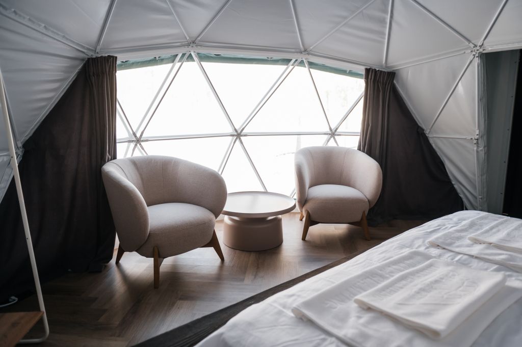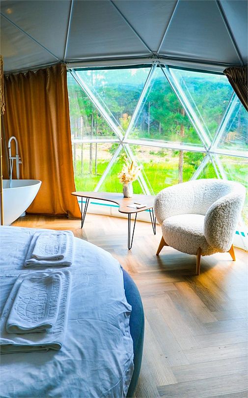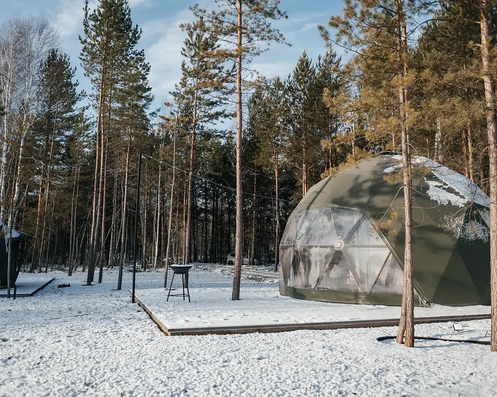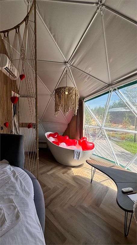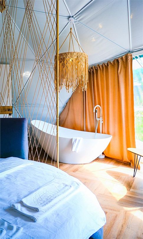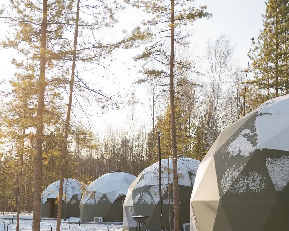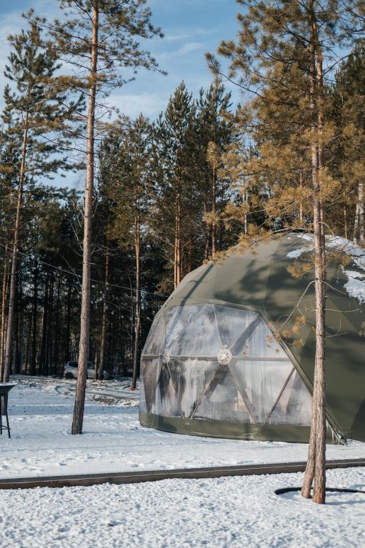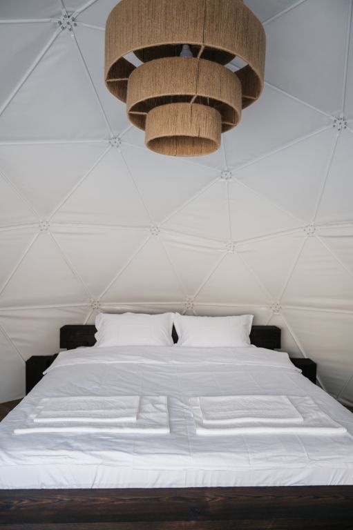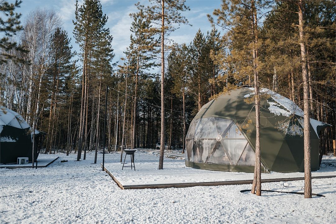 Купольные дома-сферы с панорамными окнами, расположенные среди живописного леса, обеспечивают полное единение с природой. Глэмпинги площадью от 33 до 53 м² оснащены всем необходимым для комфортного проживания: ортопедические матрасы, уютная мебель и хорошо оборудованные ванные комнаты. Каждая сфера имеет террасу с мебелью и зоной для мангала. Есть сферы с купелью и баней Фурако.