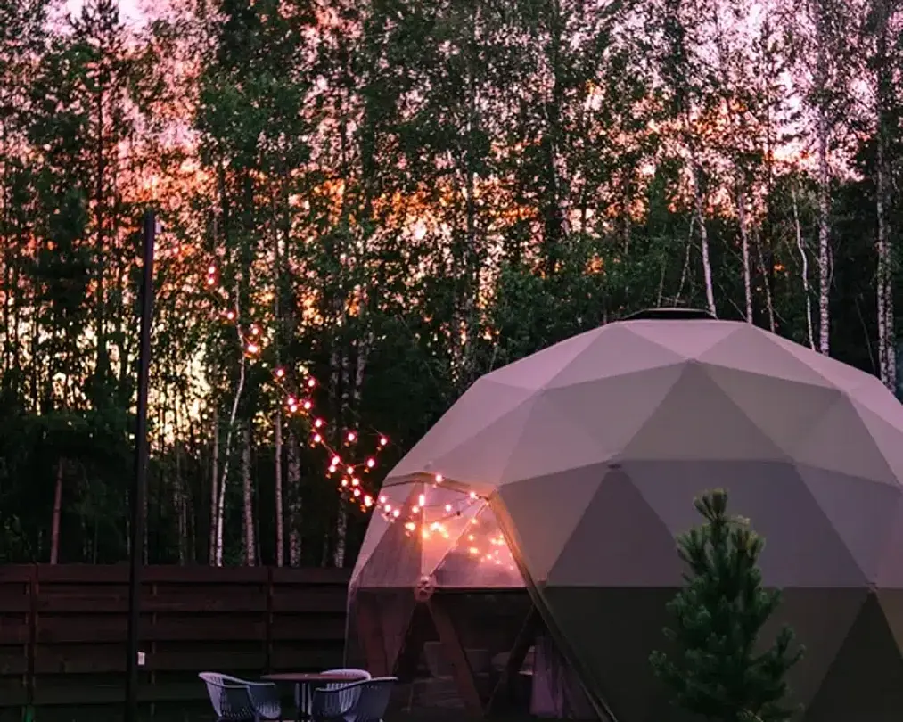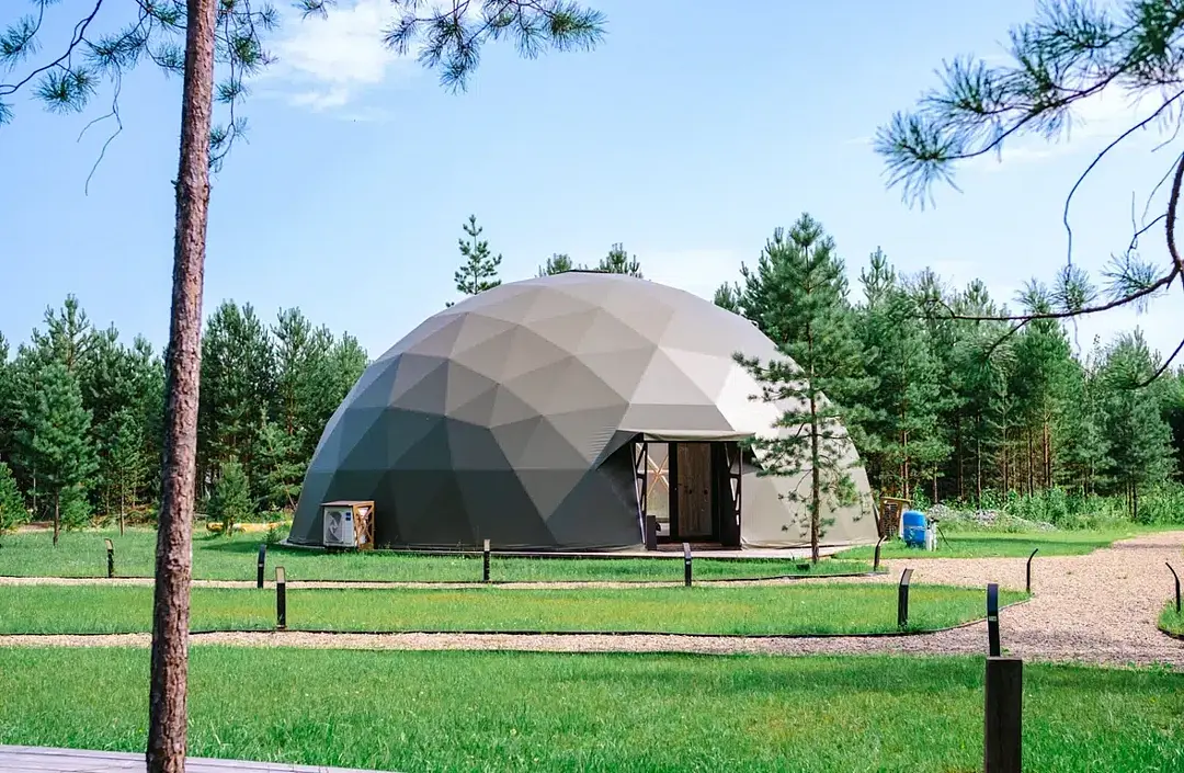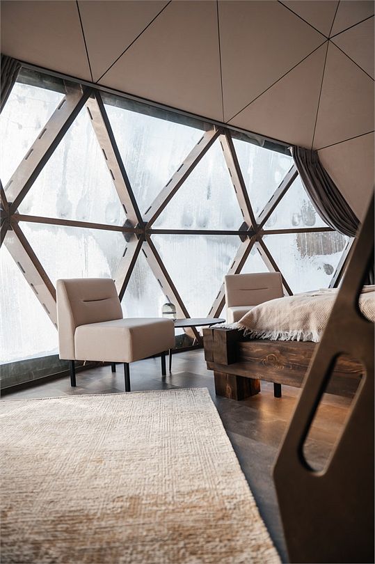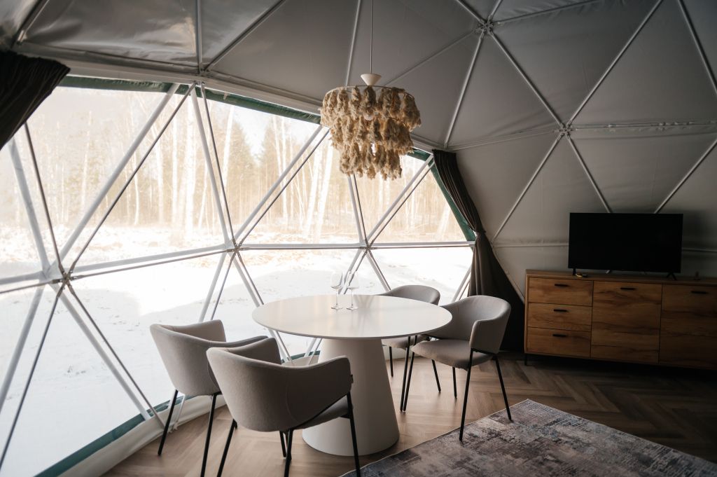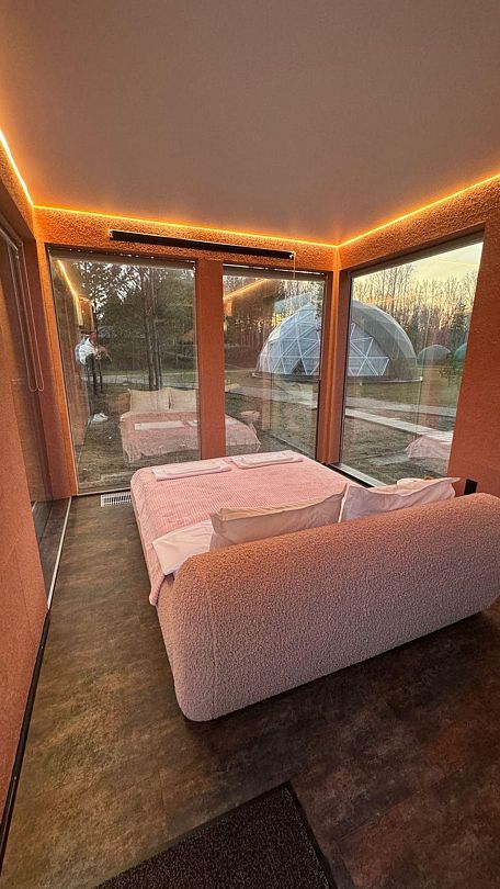 Роскошный дом-сфера площадью 38 м2 с дизайнерской отделкой, панорамными окнами и живописным видом на лес.