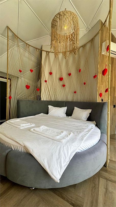 Оригинальный номер площадью 3 3м2, интерьер которого сочетает в себе гармонию и стиль, что создает атмосферу, соответствующую самым романтичным мечтам: кровать, имеющая форму круга, предоставляет возможность уютного прикосновения, окутывая Вас своими нежными объятиями, отдельно стоящая ванна просто зовет Вас окунуться в атмосферу нежности и релакса, а также собственная терраса с мангальной зоной. Рассчитан на проживание двоих гостей.
