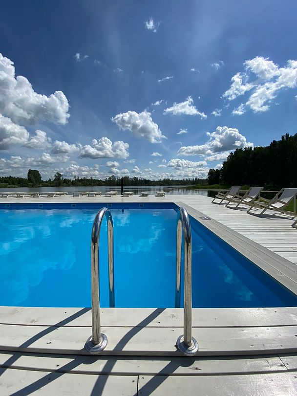 - для отдыхающих весь сезон работают два просторных бассейна (20*10 м и 10*5 м), в которых можно наслаждаться купанием тем, кто предпочитает искусственные водоемы натуральным. Взрослый бассейн — глубже (1,5 м), с более прохладной водой и стильным искусственным водопадом. Детский мельче (0,6 м), размером 12*6 м, и оснащен подогревом 26-28 градусов. Пространство вокруг оборудовано настилами из натурального дерева и аккуратным газоном, на котором тоже можно уютно устроиться для приема солнечных ванн.