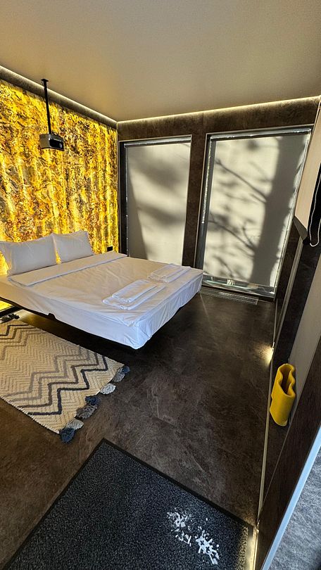 Зеркальные домики, сливающиеся с природой, создают ощущение полного единения с лесом. Двуспальная кровать queen size (160*200). Рассчитан на проживание двоих гостей, с возможностью поставить одно дополнительное спальное место.