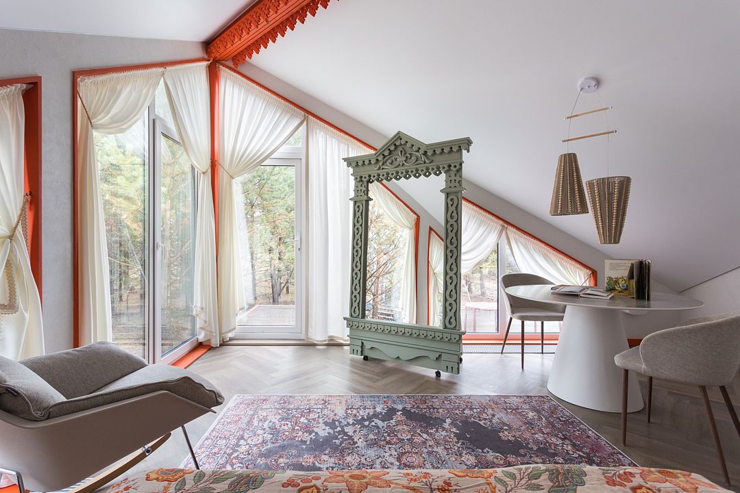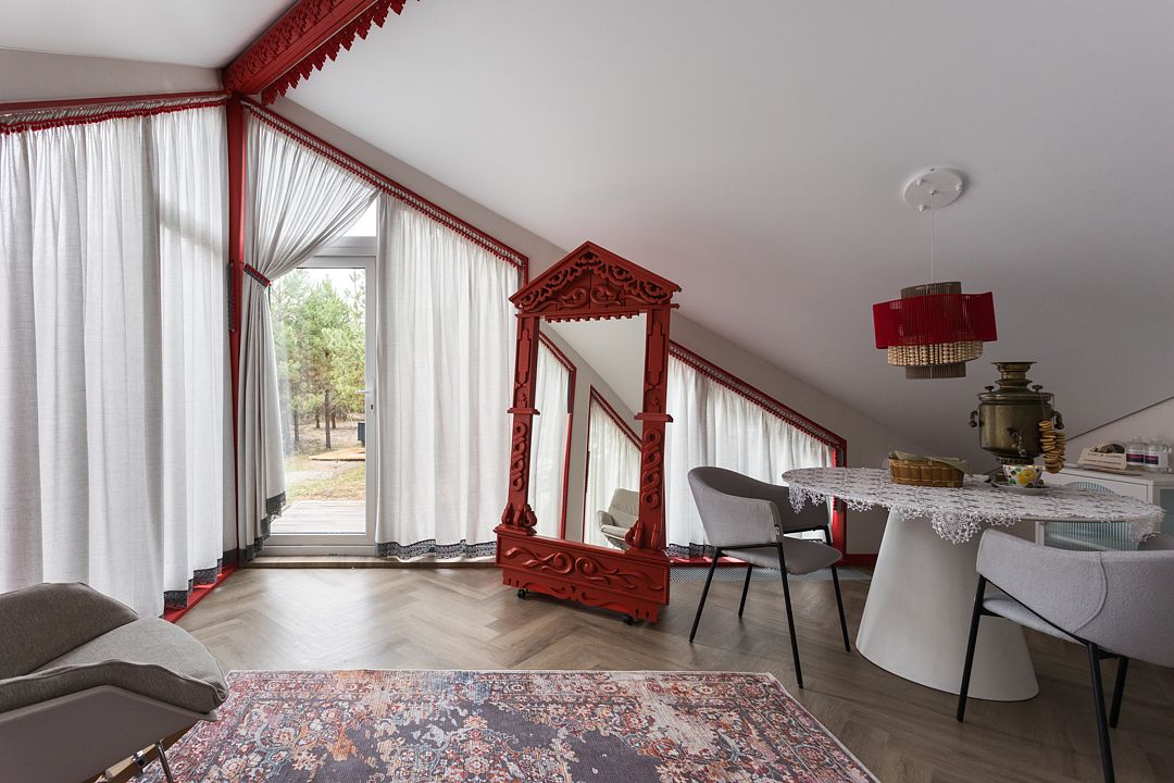 Переступая порог этого дома, вы переноситесь в пространство, объединяющее в себе современный комфорт и атмосферу a la russe. Двуспальная кровать queen size (160*200). Рассчитан на проживание двоих гостей. Возможно предоставление одного дополнительного спального места по запросу.