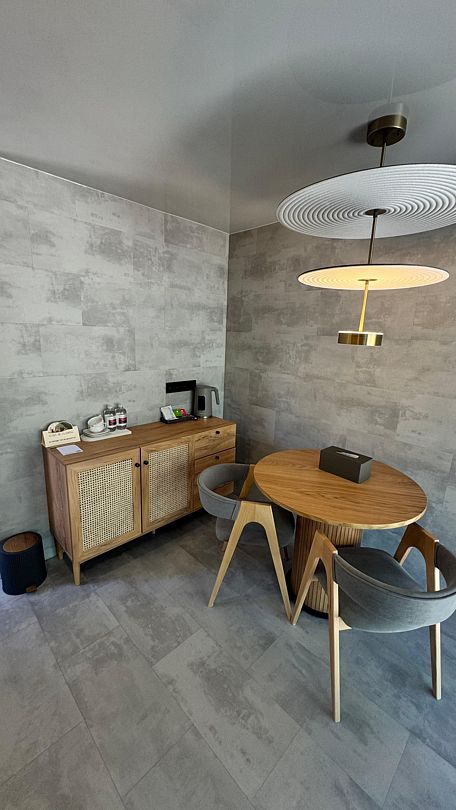 В номере имеются двуспальная кровать king size на первом этаже, 2 спальных места на мезонине, санузел с душевой кабиной. Кроме того, в доме есть терраса с мангальной зоной, где вы можете проводить время с семьей и друзьями или просто наслаждаться уединением. Рассчитан на проживание до четырех гостей.