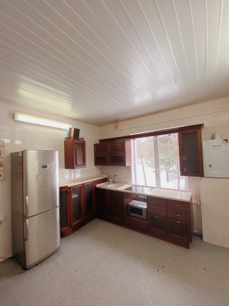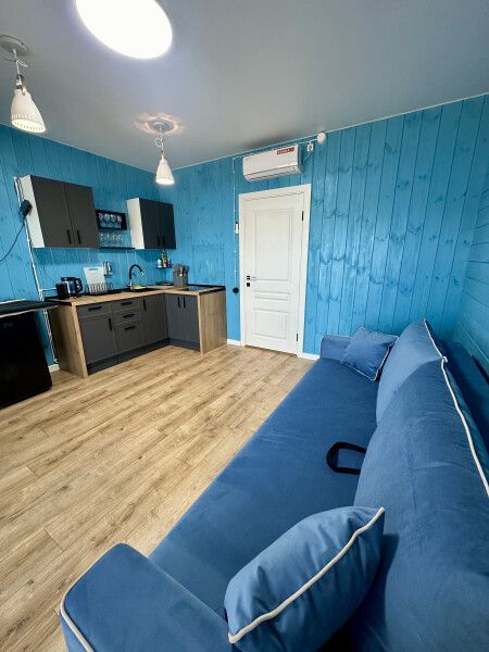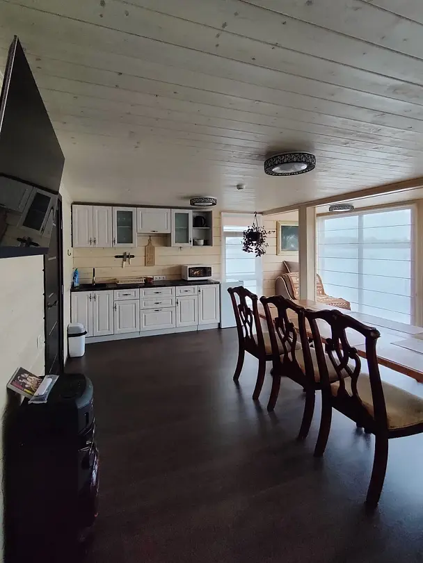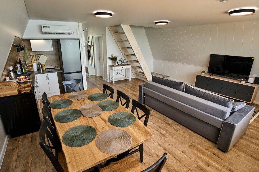 Первый этаж: кухня-гостиная оборудована кондиционером, зал с зоной отдыха: 2-местный диван (с возможностью размещения гостей на ночь), телевизор, колонка «Алиса», Wi-Fi. Обеденный стол на 8 человек. Оборудованная кухня (микроволновка, холодильник, индукционная плита, посудомоечная машина, чайник, полный комплект посуды).