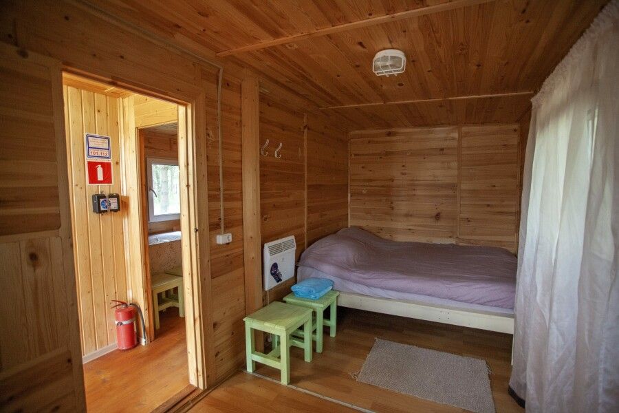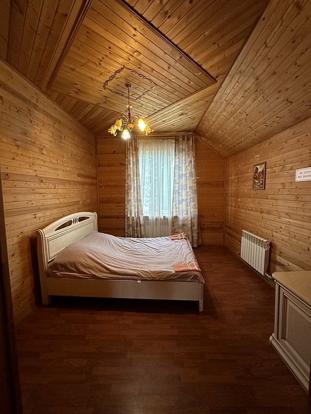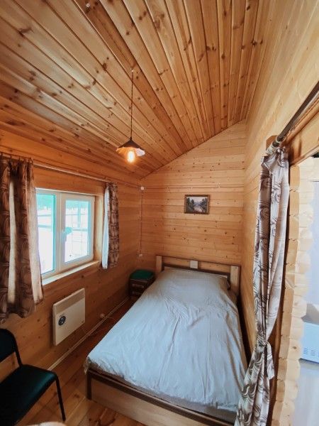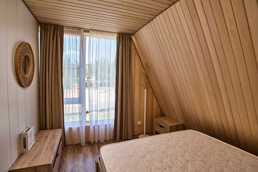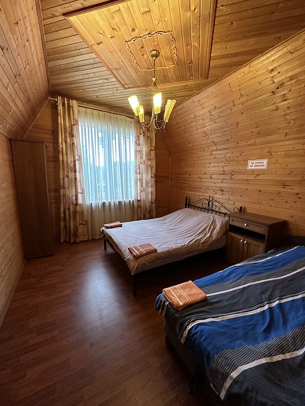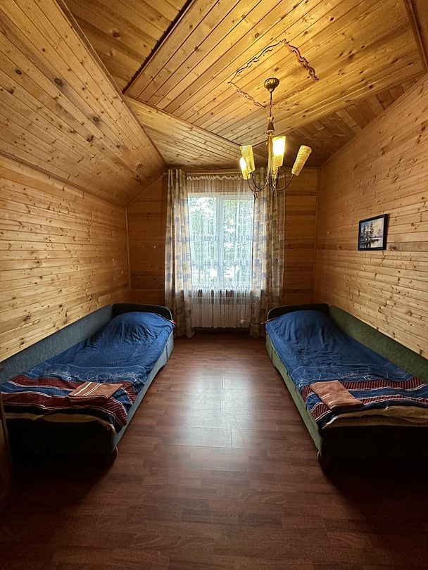 Второй этаж: две изолированные спальные комнаты. В каждой комнате одна двуспальная кровать, матрас ортопедический 160х200; мини-холодильник; тумба; вешалка; комплект постельного белья. Из одной комнаты выход на балкон с видом на озеро. Во всех спальных комнатах шторы «блэк-аут».